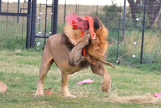 Providing our rescued lions and tigers with a beautiful, natural home and enriched lives is so important to us. Good for their mental and physical wellbeing, all of the animals also have extra features in their habitats and treats that have been created by the ADI team rather than nature to enjoy. These include platforms they can climb up onto and watch the world go by, tire swings to grapple and play with, and other enrichment such as boxes filled with hay and natural scents which they love – especially our younger boys – as you can see!