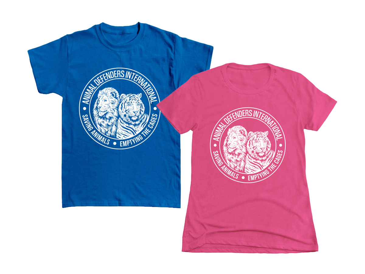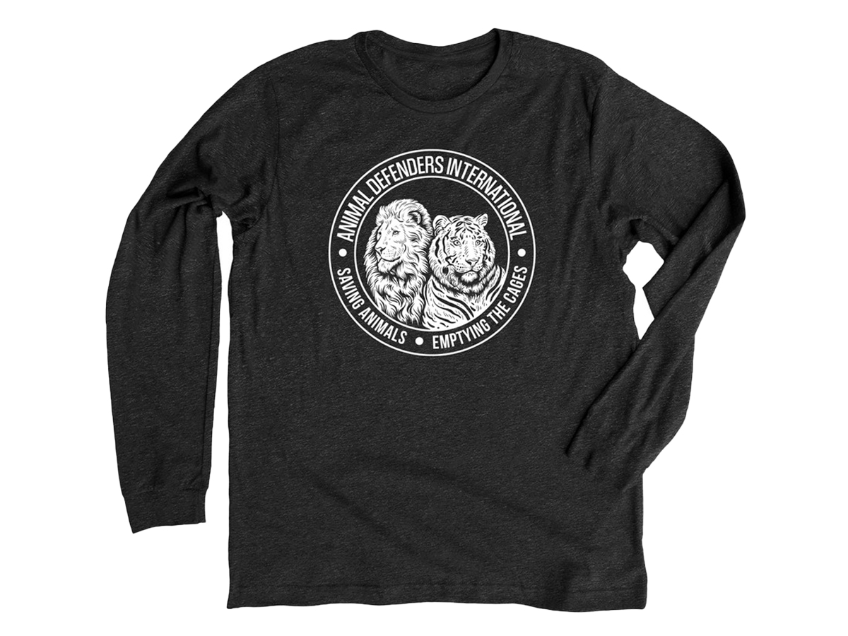 We’ve launched a new range of t-shirts, tanks and sweatshirts (available only until August 18th) in a range of colors, featuring tiger Kumal rescued from a circus cage in Guatemala and lion David saved from a circus in Peru. Both are now loving life at the ADI Wildlife Sanctuary.