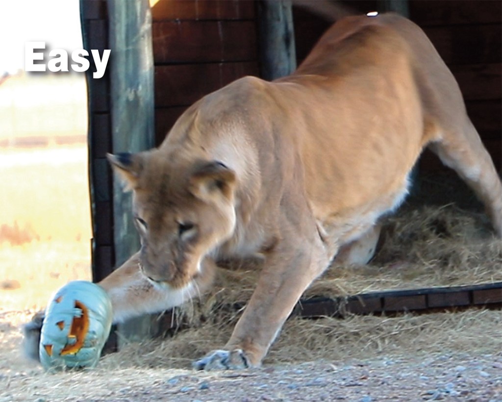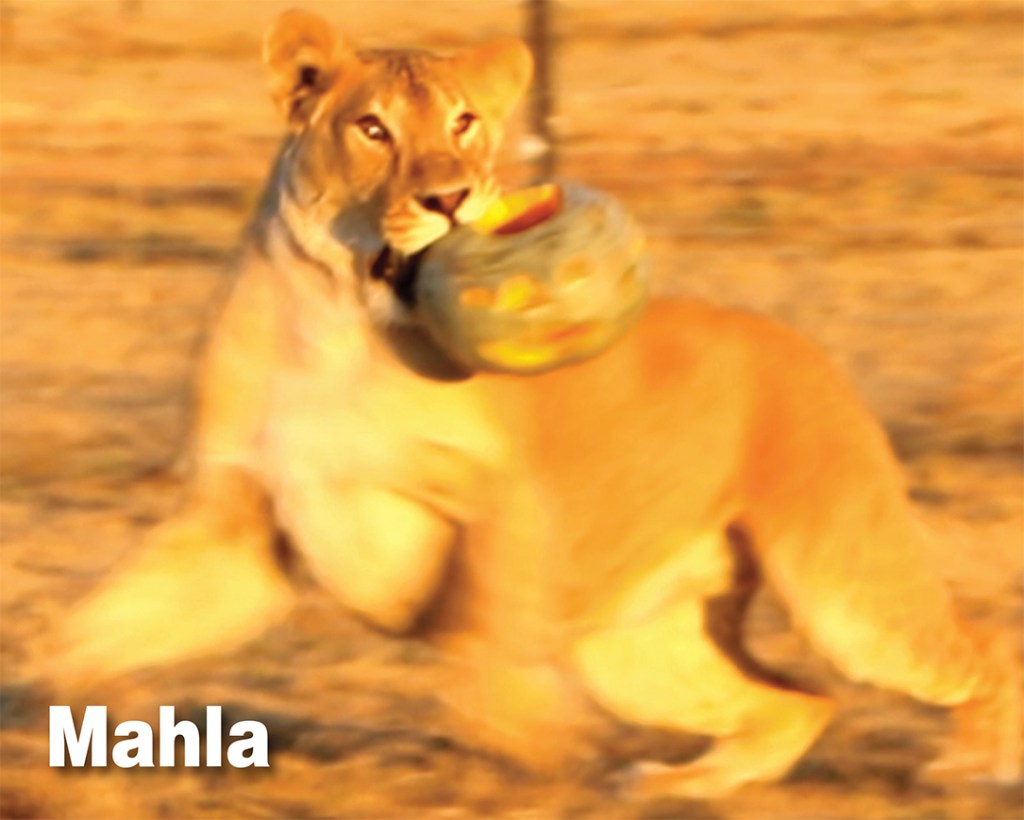 Last Halloween – our first one with the lions at the ADI Wildlife Sanctuary – we took carved pumpkins out to them. The Cusco family, Scarc, Mahla, Amazonas and Kiara, bounded on and off the platforms with pumpkins in their mouths, trying to steal each other’s pumpkins, before hurtling off into the main habitat with their treasures. Simba, Kesari, Chino and Coco all tried to gather as many pumpkins into one place as they could, and Easy and Shakira bounded off into the distance together playing kick-pounce-catch-pumpkin. You can see for yourself in the video below.