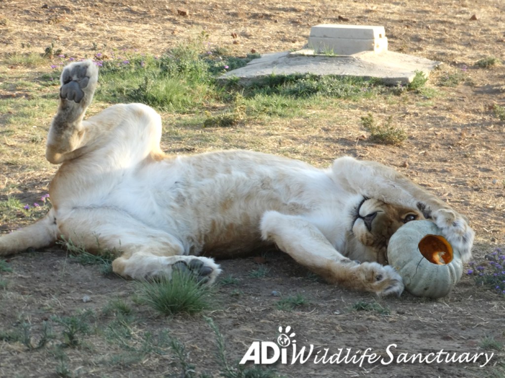 Although our lions and tigers have huge habitats to roam and other important enrichment like catnip and hay boxes, tires and other toys, pumpkins are always an extra special treat. Look at all the fun they had last year! Help them make up for all those years in the circus where they lived in tiny, miserable cages with nothing to interest or engage them.