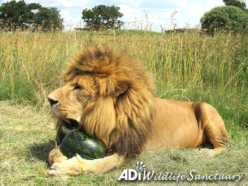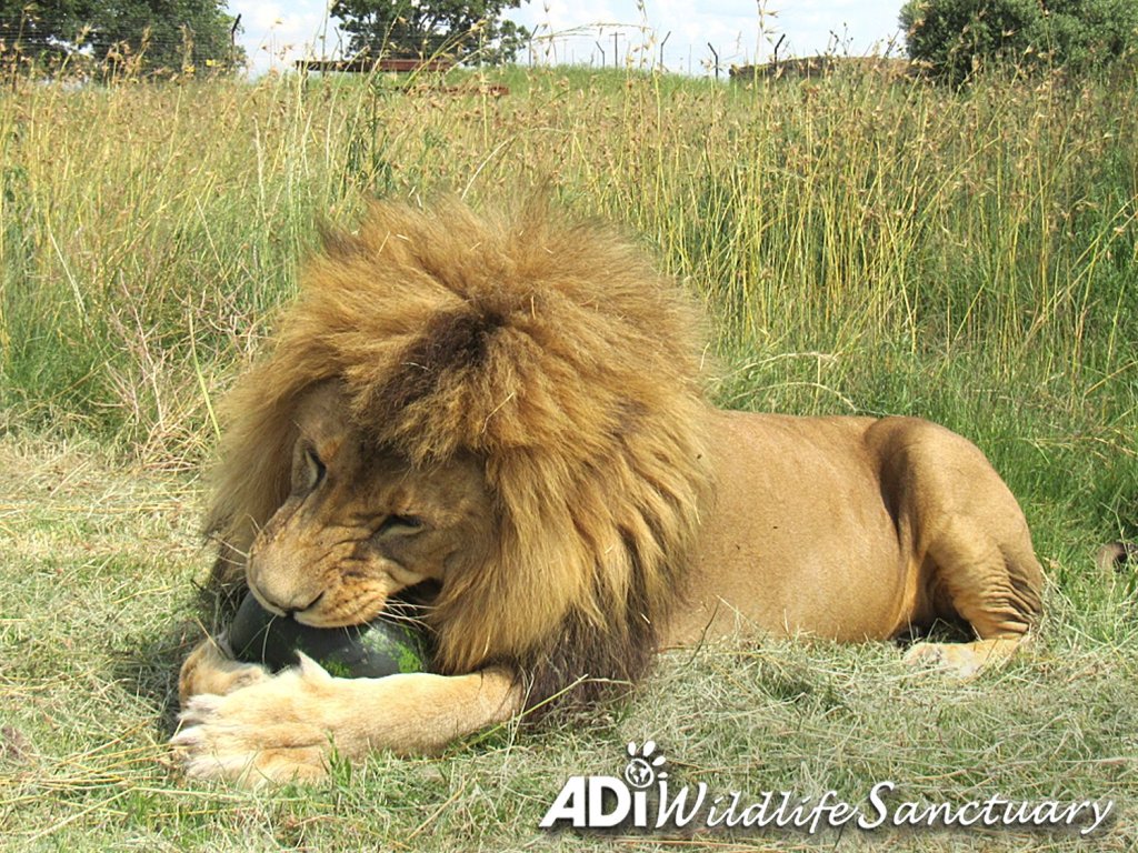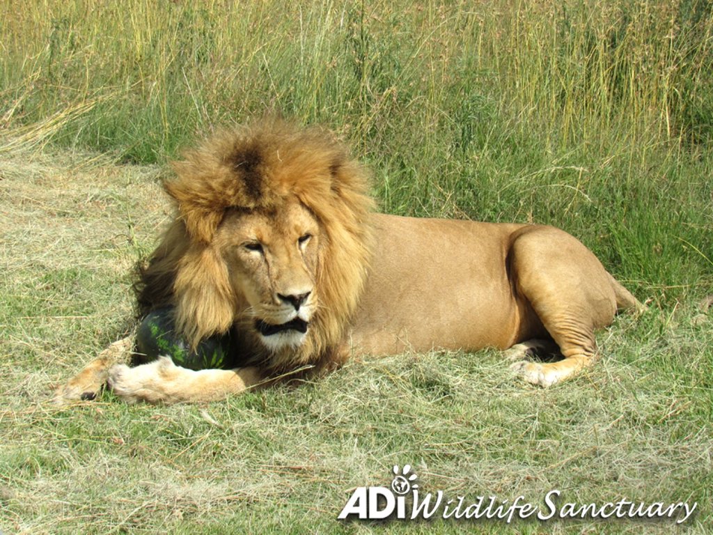 “MINE, ALL MINE!” You really wouldn’t want to try and get this watermelon out of Rey’s protective paws once he has started playing with it. Rey was rescued from a circus in Peru and now lives at the ADI Wildlife Sanctuary where the rescued lions and tigers enjoy a range of toys for enrichment including melons, pumpkins, catnip boxes and balls. ReyC and his brother Smith have a habitat of over 6 acres of natural African landscape to roam – a very different world to the small bare circus cage we rescued them from. However, our enrichment and toys are still vital for keeping the lions and tigers in our care physically and mentally active. Enrichment is an important addition to giving the animals the space they need to express themselves and we think you can tell what Rey’s prize means to him in these pictures!