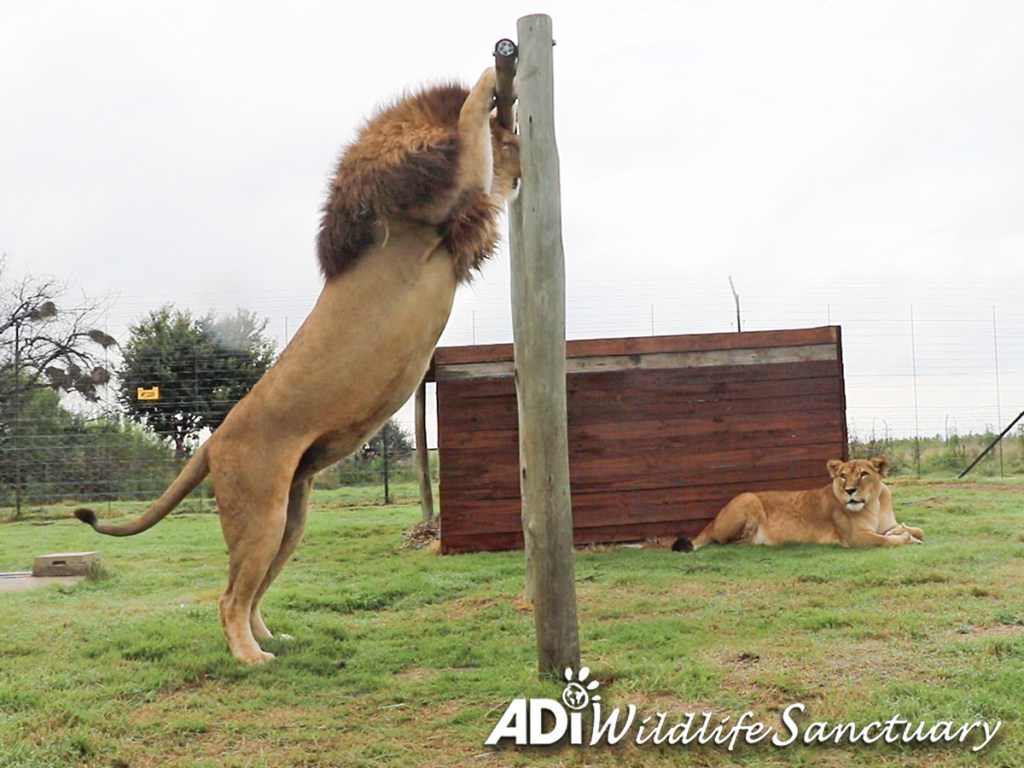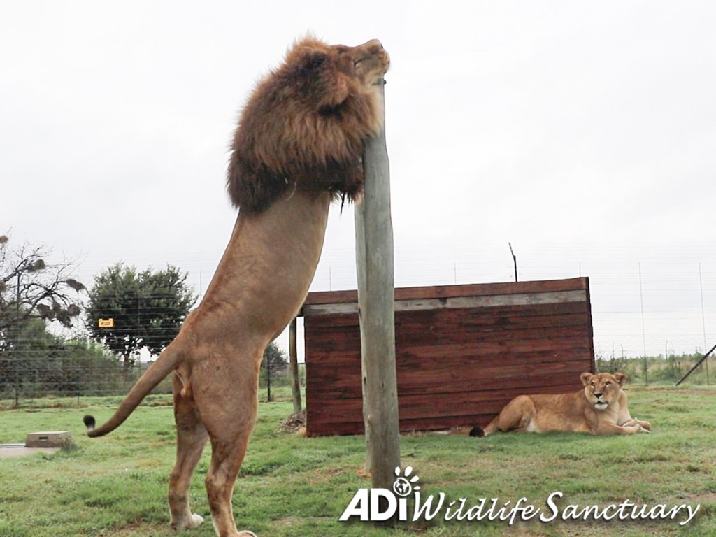 Yes, David and Easy, the first of our Lonely Hearts Lions, are together. The door between their rooms in their house at the ADI Wildlife Sanctuary in South Africa was slowly opened and the two lions rubbed heads and then walked out to their feeding camp. It has been a slow and careful process, where David, rescued from a circus in Peru, and Easy, rescued from a circus in Colombia, have been brought close to each other and received a spray of the hormone to encourage feelings of friendship towards each other. Both were very gentle and respectful of each other, with David edging closer and closer to Easy. For a day, Easy seemed to feign disinterest in David – she didn’t seem too impressed when he started to show off, even seeming to do pull-ups! But if he walked away, she would immediately go to find him. We have been monitoring them around the clock and they have been sleeping in the same night room. Today, it is clear they have bonded as friends. They are no longer alone.