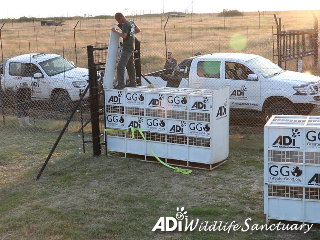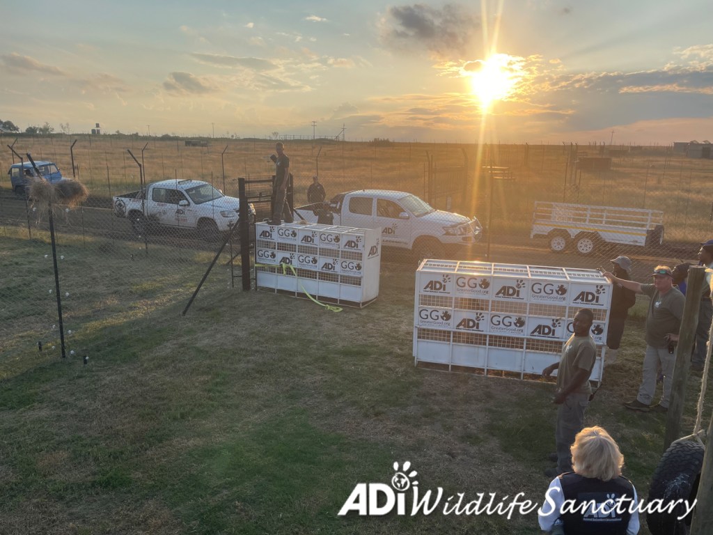 ADI Wildlife Sanctuary sweethearts Tarzan and Tanya are home, after a stay at the Old Chapel Veterinary Clinic for dental surgery and a partial lip lift for Tarzan. They arrived home just before sunset. Tanya headed out into the habitat while Tarzan settled down in his crate and watched the world go by as it grew dark! That’s ok, he could see Tanya and we are used to Tarzan’s very gentle pace. Tomorrow morning, they can get back to their normal routine.