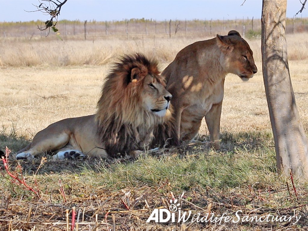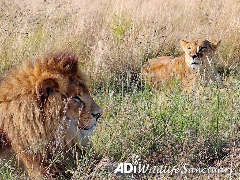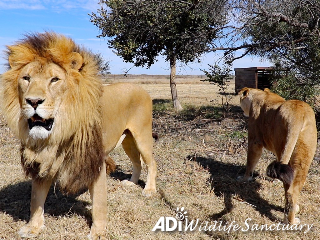 Lions David and Easy have been enchanting the whole human population at the ADI Wildlife Sanctuary, as their bond has grown closer, and they follow each other around the habitat. We love that when they travel up to the end of the habitat, if David is in front, he stops and waits for Easy to catch up. When Easy moves off to explore, she will wait for David, and they do an affectionate head bump.