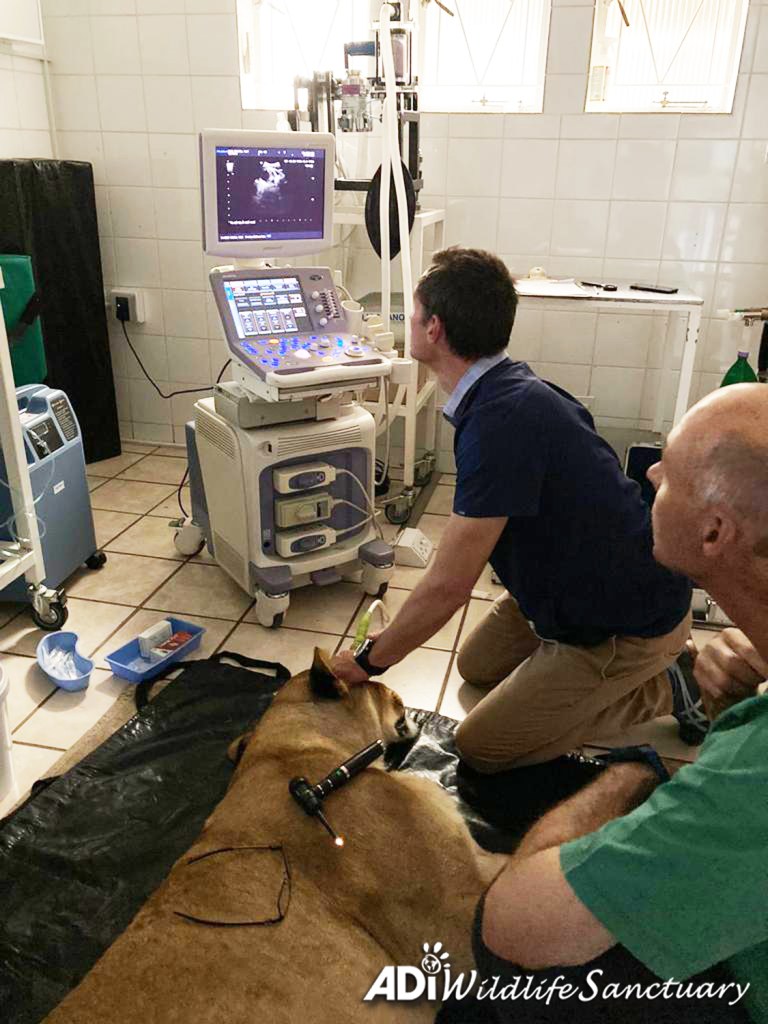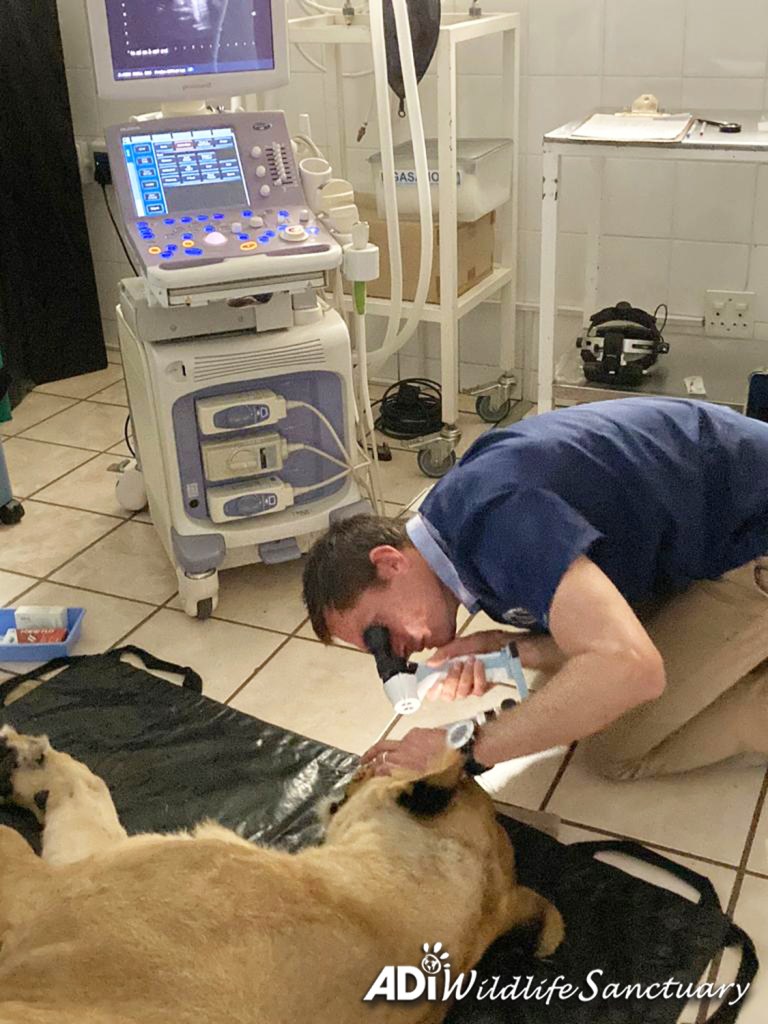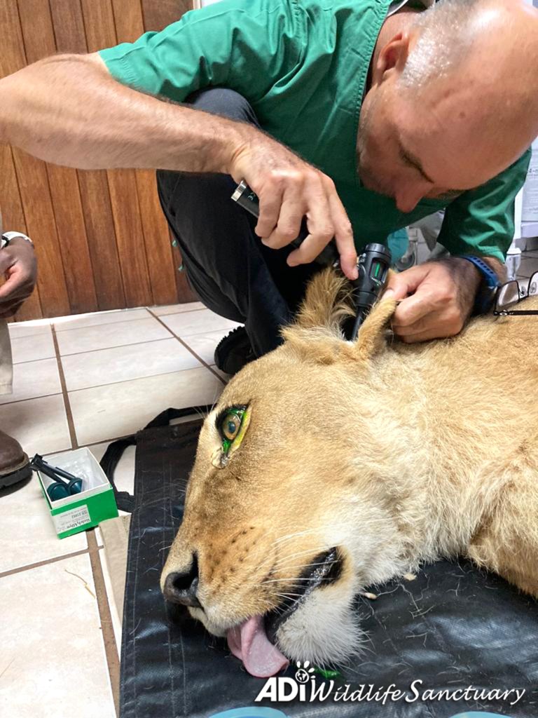 Ophthalmologist Dr Paul Burger also examined her eyes. Like many of the lions rescued by ADI from circuses in Colombia and Peru in 2014, Easy is developing cataracts. These are often instigated by years of malnutrition in the circus early in life and we do our best with healthy food and supplements to hold them at bay. At present Easy has 10-20 % vision in her right eye and 70% in her left. This is not causing her problems exploring Camo Habitat with David.