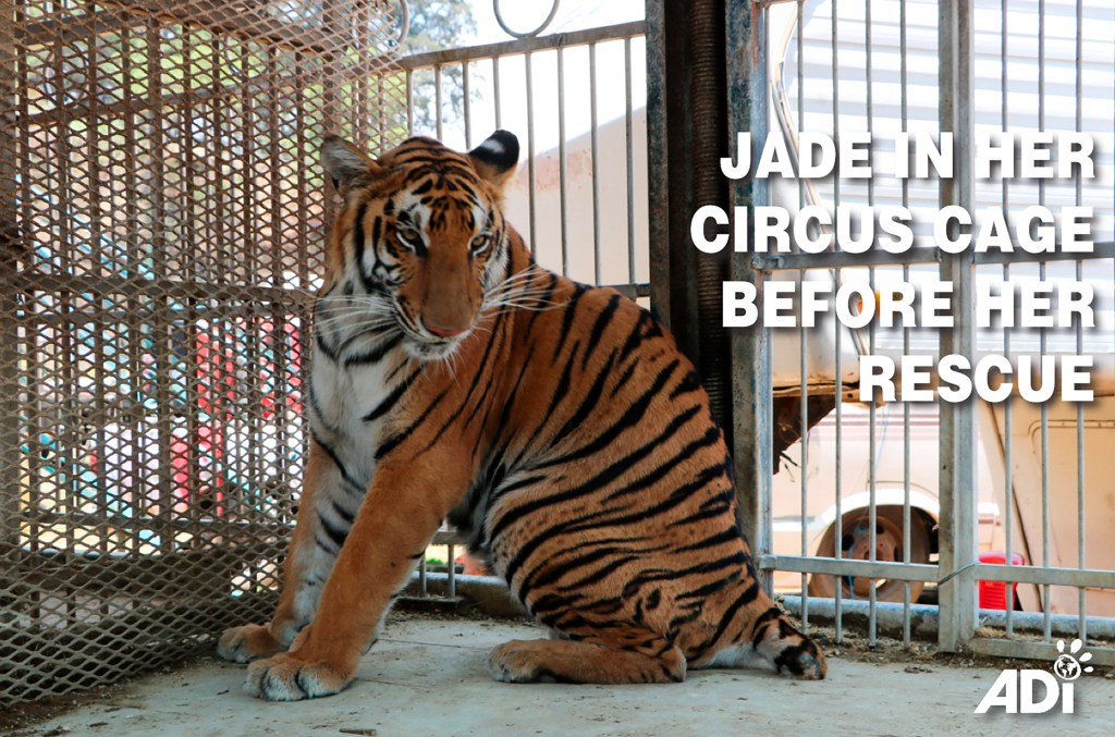 It was three years ago this week that Jade stepped from her travel crate at the ADI Wildlife Sanctuary after an epic journey from Guatemala where she had been rescued from a circus. What must have been going through her mind? It proved to be a huge step into a new life for Jade (and indeed the 16 other tigers and lions who arrived with her). Our pictures give a glimpse of three years of racing around her habitat, causing trouble and playing with her sisters (the Spice Girls), lounging in her pools and exploring. A life transformed thanks to ADI supporters – and it began with that step three years ago. Thank you.
