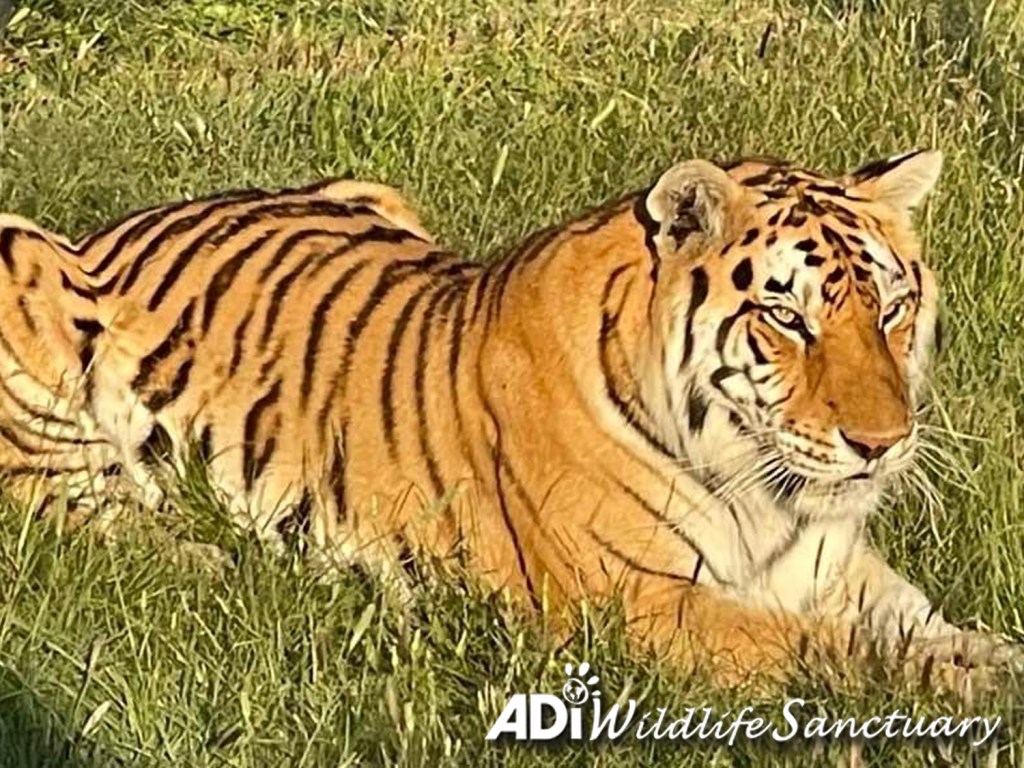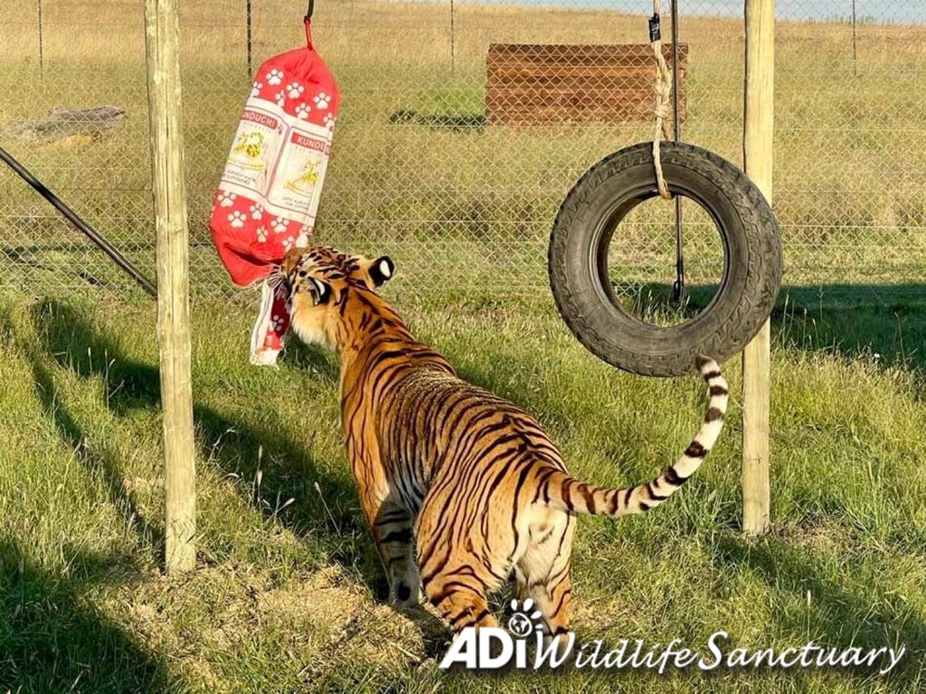 Sasha tiger is having fun swinging on and tearing into a punch bag of catnip and hay, kindly provided by Kunduchi Pet Products. Before ADI rescued her from a circus in Guatemala, she was confined to a tiny bare cage, with no room to run or play. Now she is free to have fun. Watch out for a video of these antics coming soon.