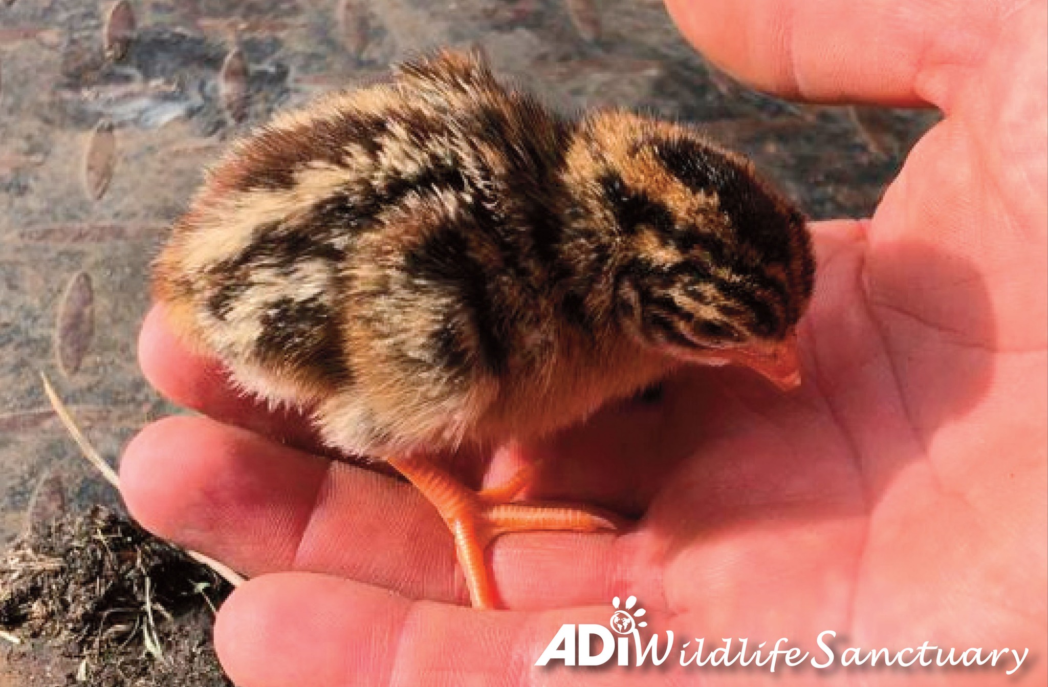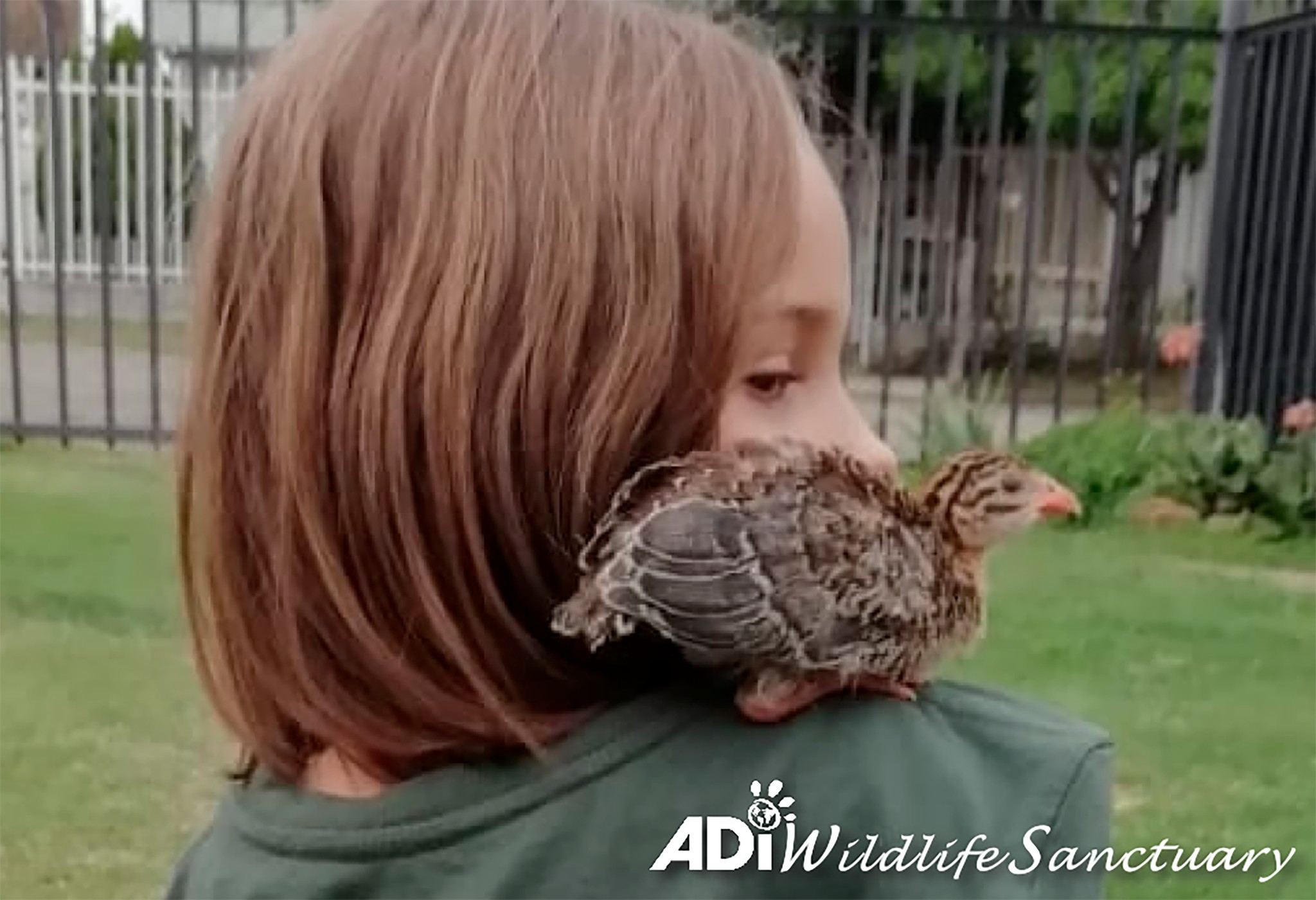 Meet Adie, a guinea fowl chick who was hand reared at the ADI Wildlife Sanctuary, after being found separated from her wild family and close to death. ADI Maintenance Specialist Kidro, with his daughter Kiara, hand reared the little chick and released her as quickly as possible, close to the other guinea fowl groups on the Sanctuary. Adie had other ideas – she has become an established member of our group of “misfits” – Tulip Turkey, Gertie Guinea Fowl (both already on the land when we purchased it), and another wild guinea fowl who joined them. Adie is growing fast and likes to visit the other guinea fowl groups, then return to the misfits – all are regular visitors around Chris Lee Lodge (our future volunteer house).