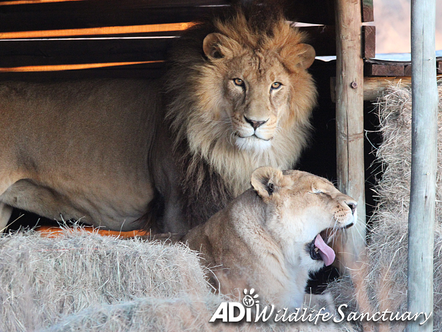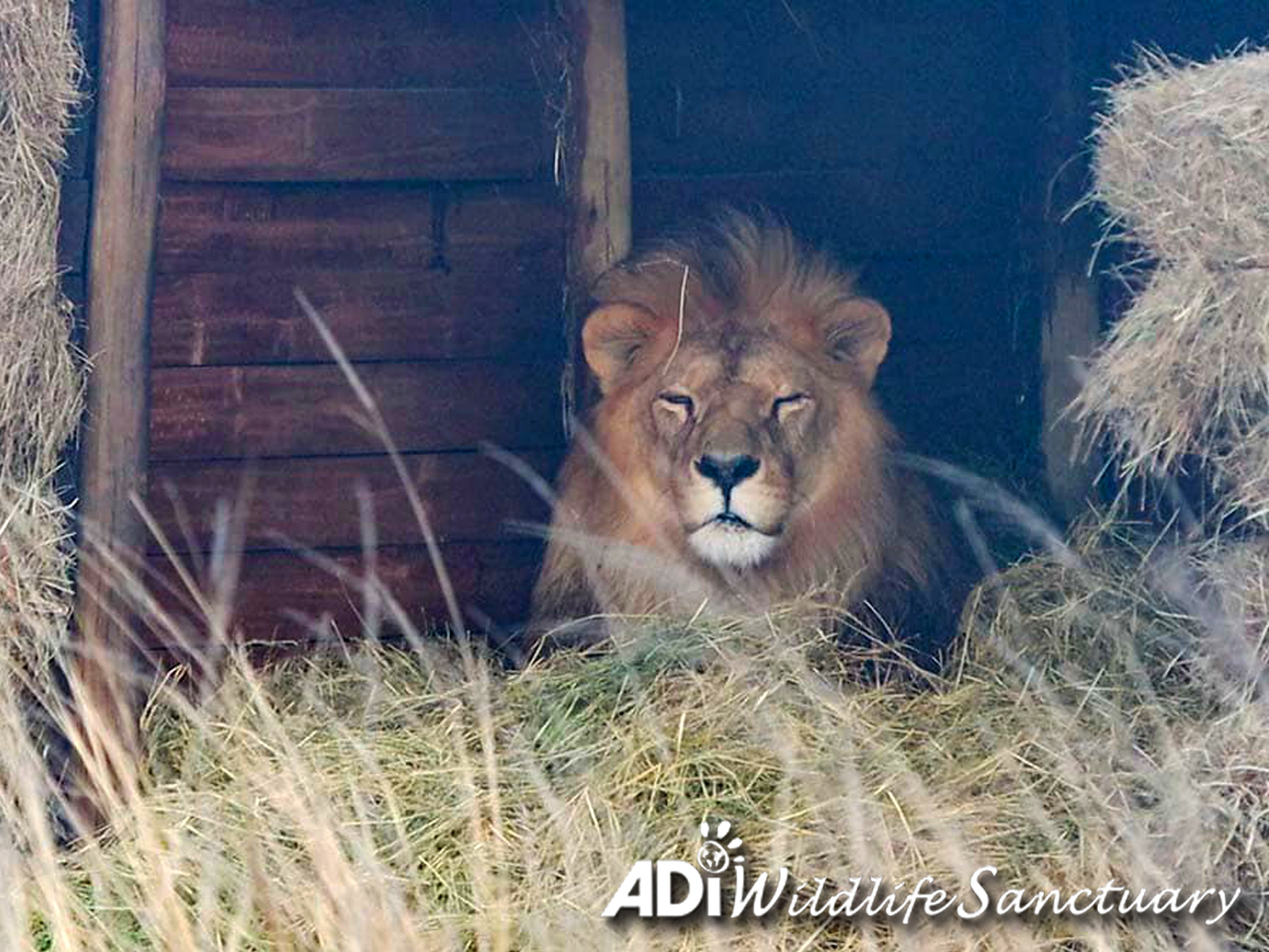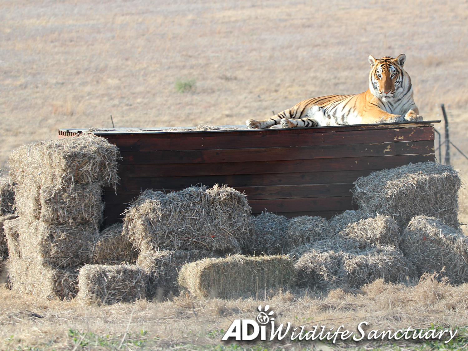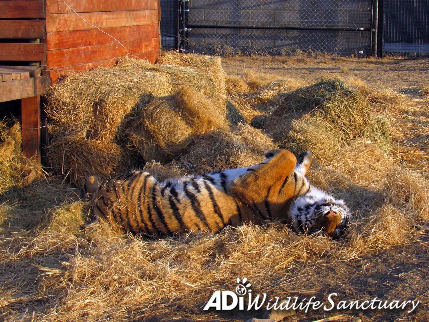 Our big cats have personal preferences for the hay bales. Seniors like Simba like to snuggle down. The young tigers Max and Stripes and ‘Spice Girls’ sisters Jade, Luna, Sun and Moon sleep snugly at night and enjoy destroying the hay bales in the morning. The ADIWS team patiently rebuilds each day!