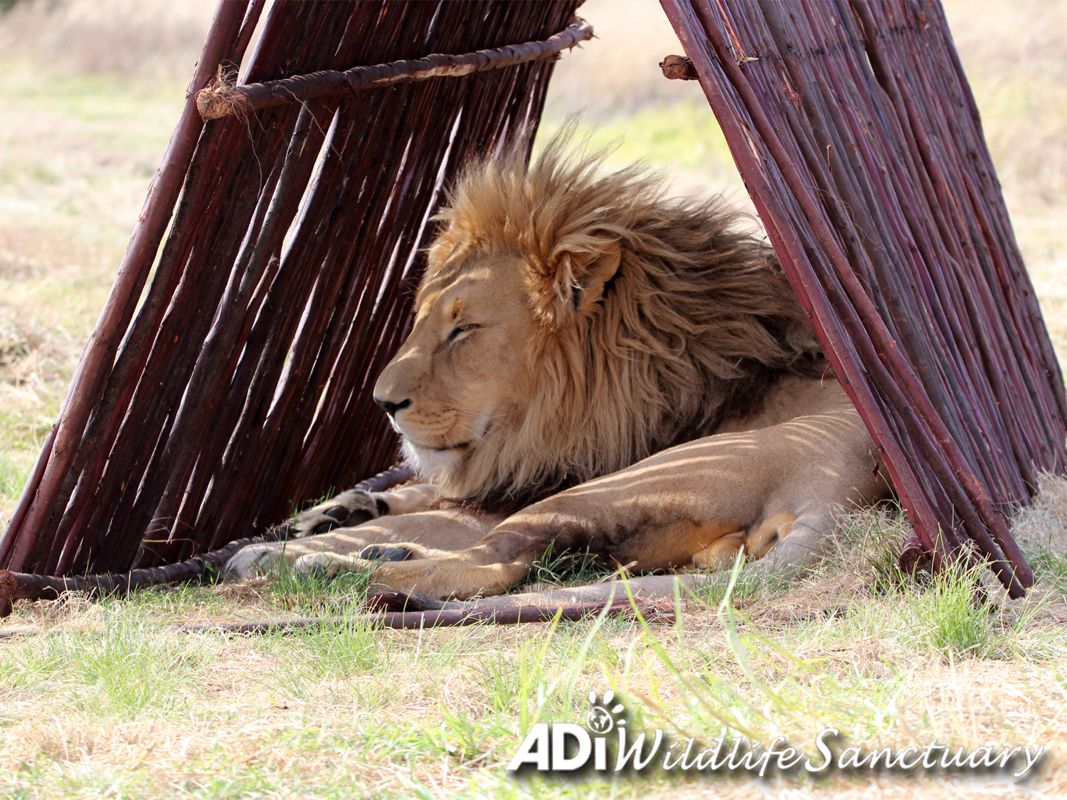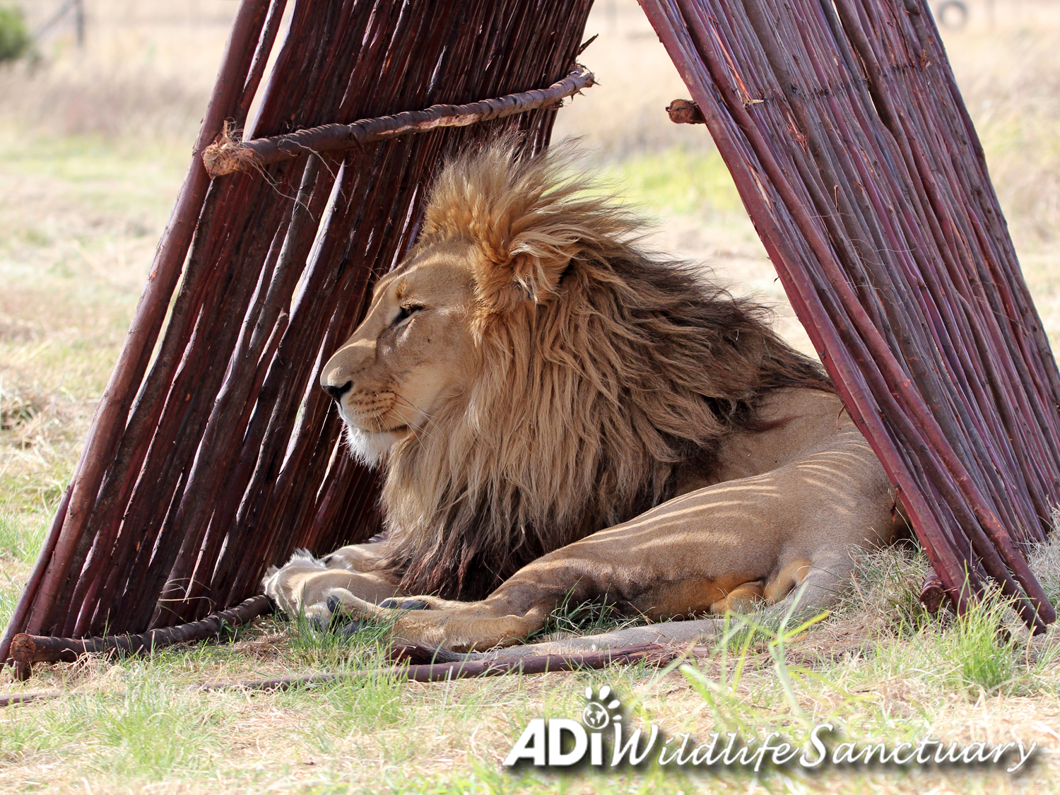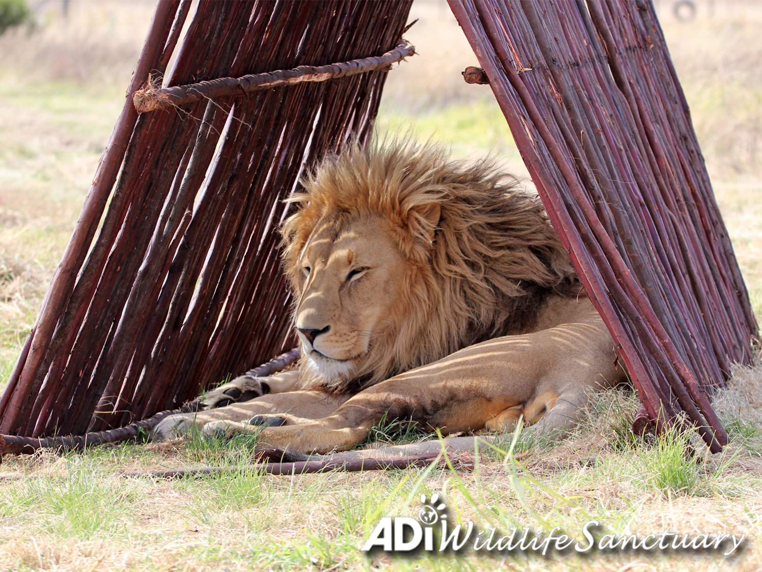 Gentle giant Kesari fills this little house!! We added A frames to the habitats at ADIWS as extra enrichment and shelter in addition to our big cats’ various platforms, houses and trees. Something new always attracts interest and you can see just how big Kesari is compared to the other lions as he fills the space.