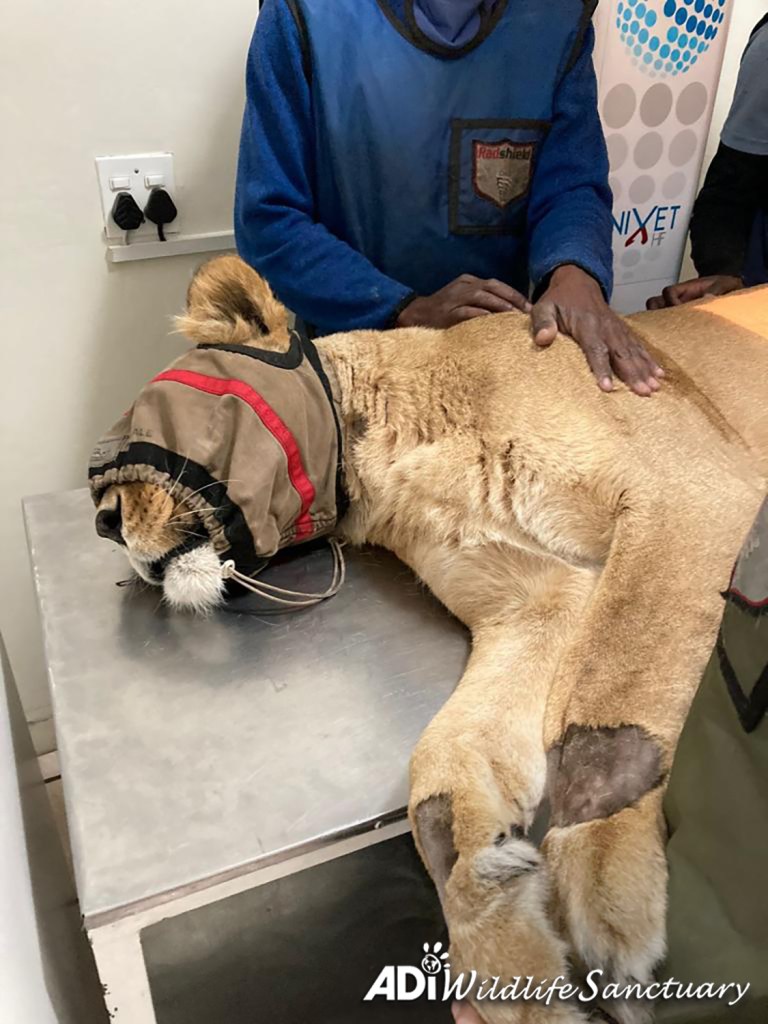 Easy, our gentle lioness rescued from a circus in Colombia, has been thoroughly examined by Dr Peter Caldwell at Old Chapel Veterinary Clinic, with blood tests, an X-ray and a gastroscopy.