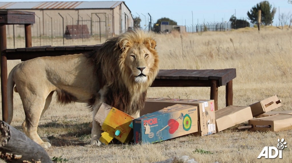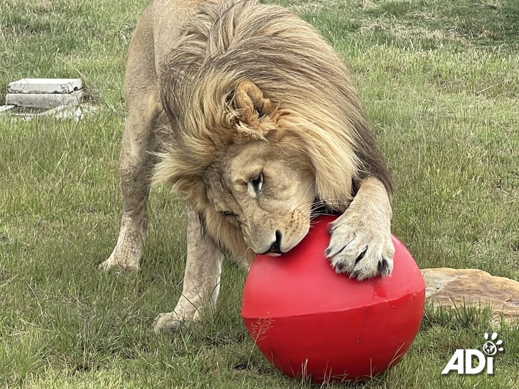 Since then, as our other pictures show – including him bringing down “a giraffe” – Kesari has become a huge, playful presence in the sanctuary, one of the loudest voices, and friends with the lions on either side of him (Chino, Coco, Simba and Rey). He is certainly not shy or cautious! As many saw watching our live when Ruben arrived, Kesari was quick to check out the new guy. It struck us how different his arrival was to Ruben’s, a reminder that all of these animals are different characters. They do things in their way and in their own time.