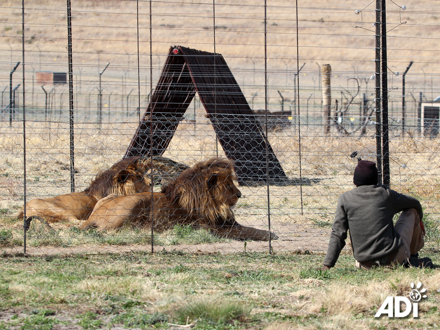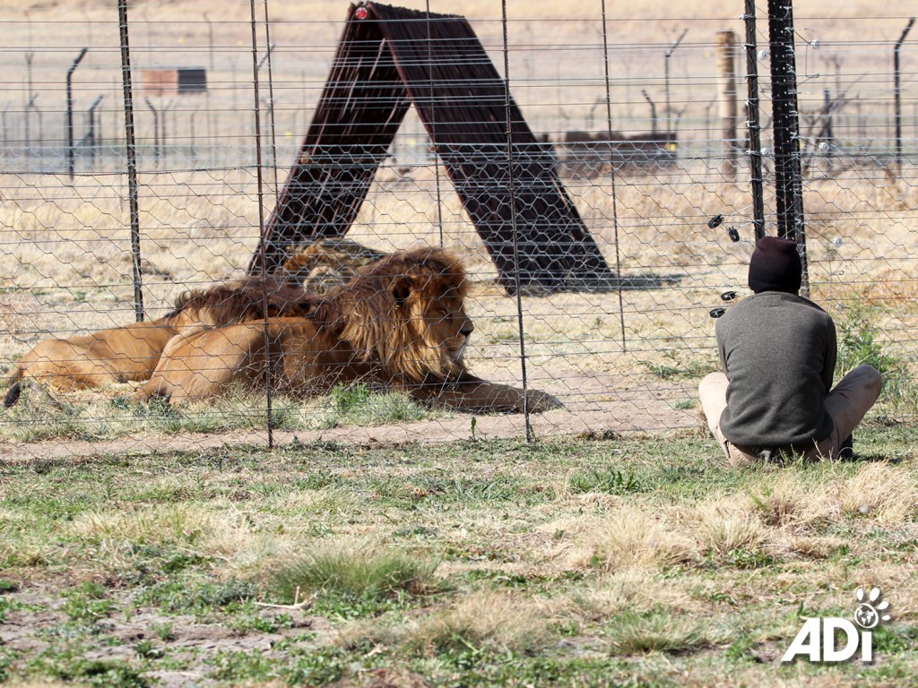 Our ADI Wildlife Sanctuary Resident Welfare Team (RWT) continues to spend time each week with our rescued lions and tigers. Here, Ernest sits with brothers Coco and Chino, rescued from a circus in Peru – their friend Kesari can be seen in the background. Bonding time is part of our work to build trust with our big cat residents. This helps us to better care for them, especially when there are medical issues.