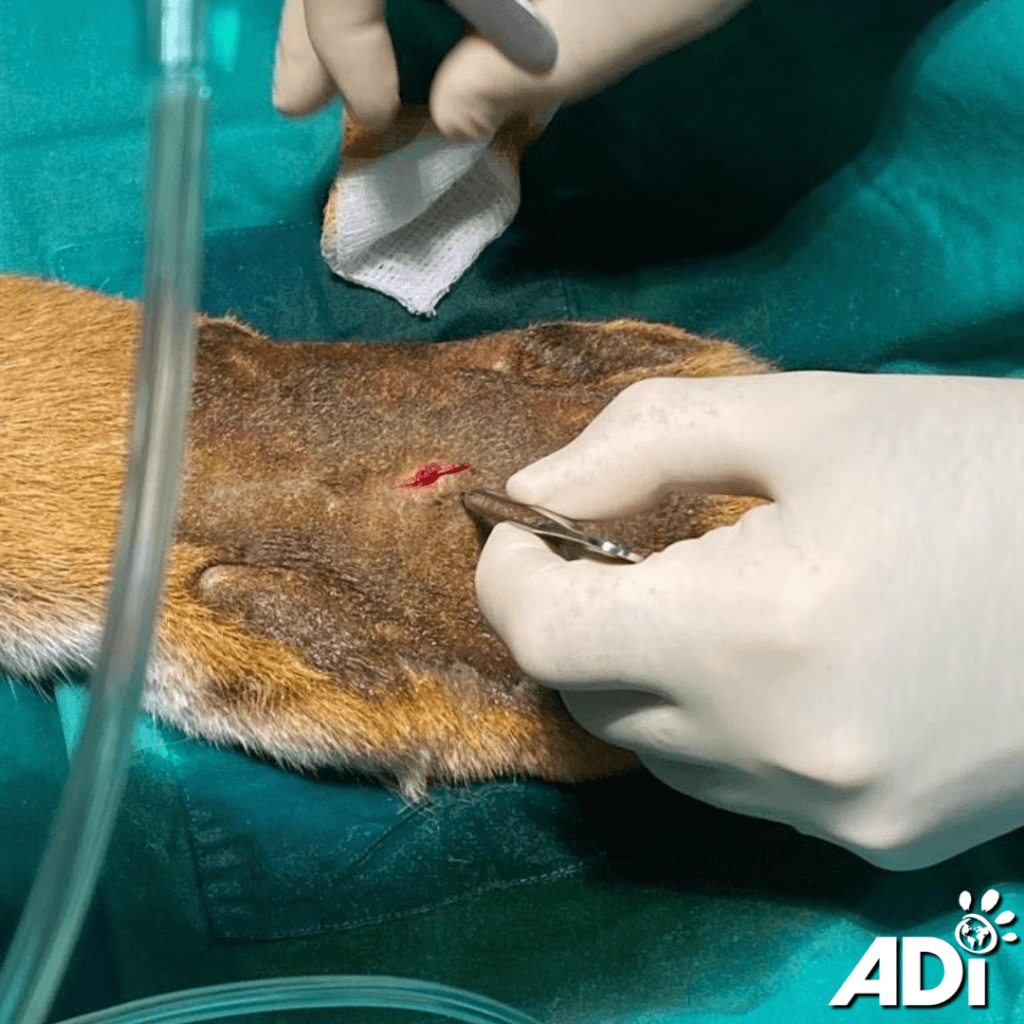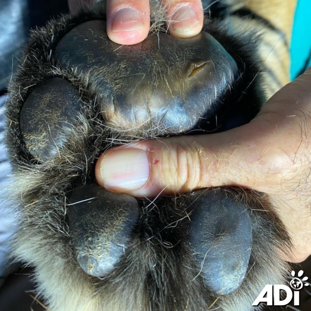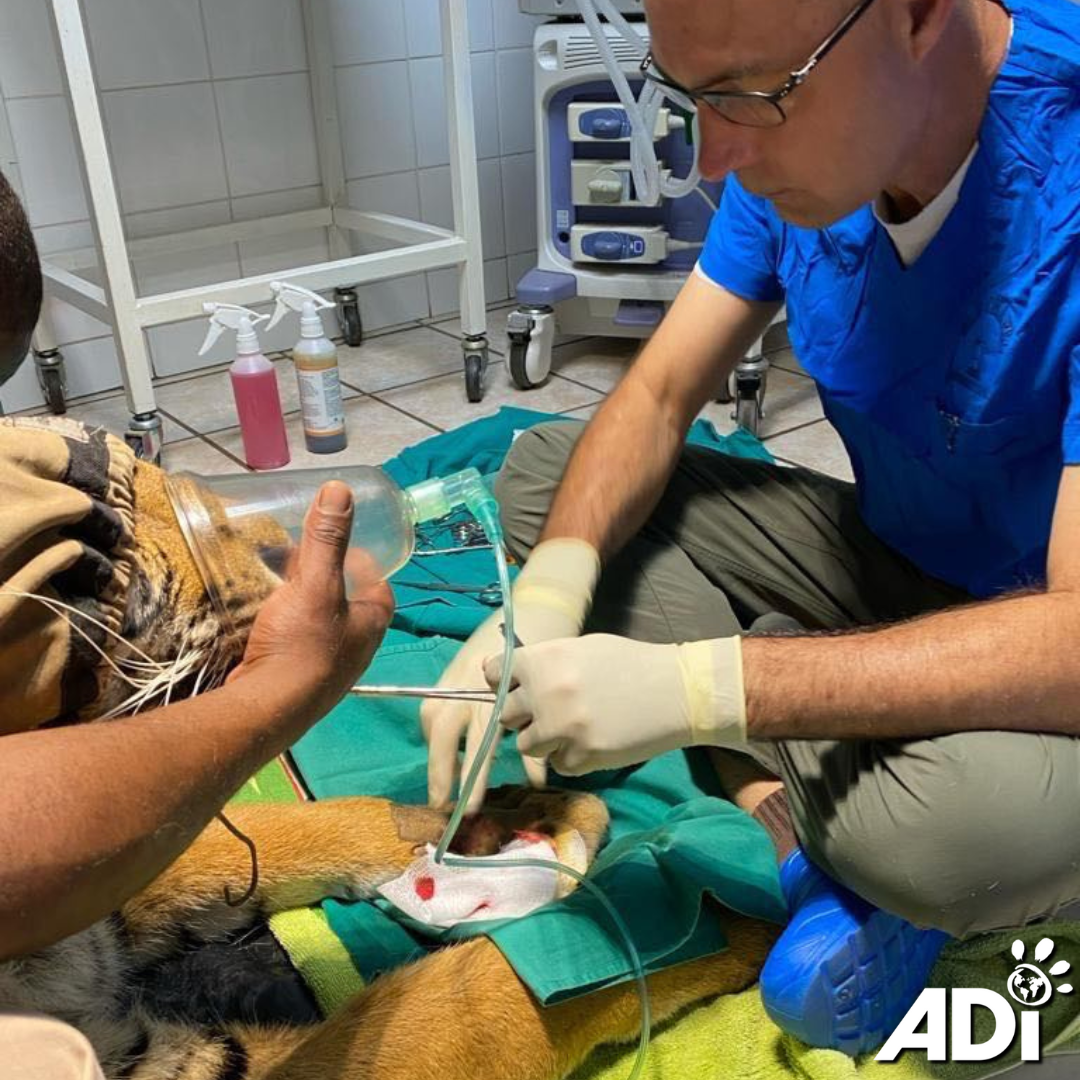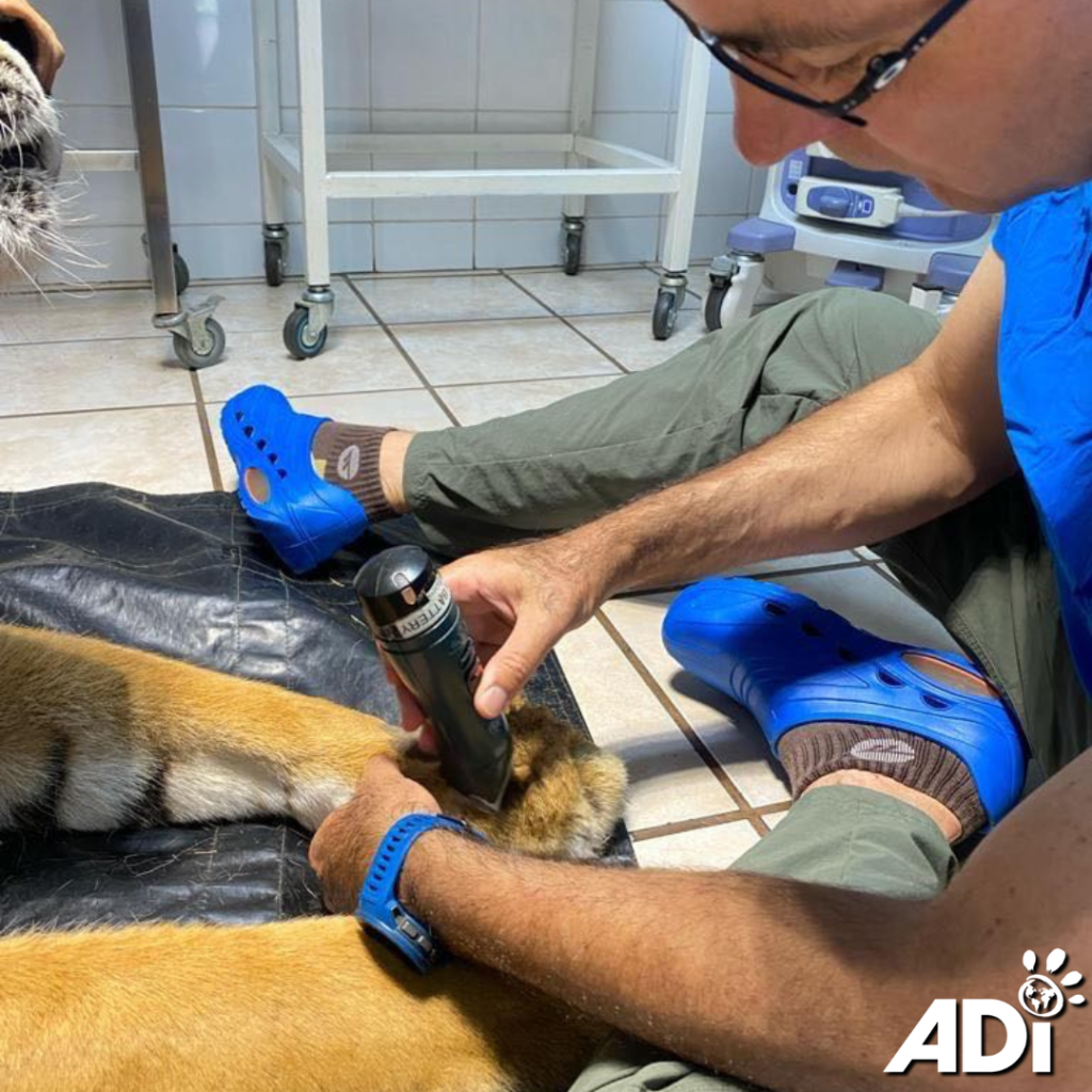 Playful Jade – one of the tigers we rescued from a circus in Guatemala – is back at the ADI Wildlife Sanctuary after a short stay at Old Chapel Veterinary Clinic and the first thing she did was rub noses with sister Luna. In hospital, Jade was thoroughly examined, including x-rays, after she was seen limping and Dr Caldwell took the opportunity to examine the problem in this family due to inbreeding and malnutrition. For Jade (and sister Luna), the malformed skull and spine connection pinches the spinal nerve, and shows as a “goose step” walk, whereas in the older females, it has caused seizures. The cause of her limp was a cut on her paw, almost certainly due to overzealous play – her followers will know what a very boisterous and noisy group our Spice Girls are! It was not infected and she is now back to her normal self and is already back out in the main habitat with Luna, Sun and Moon.