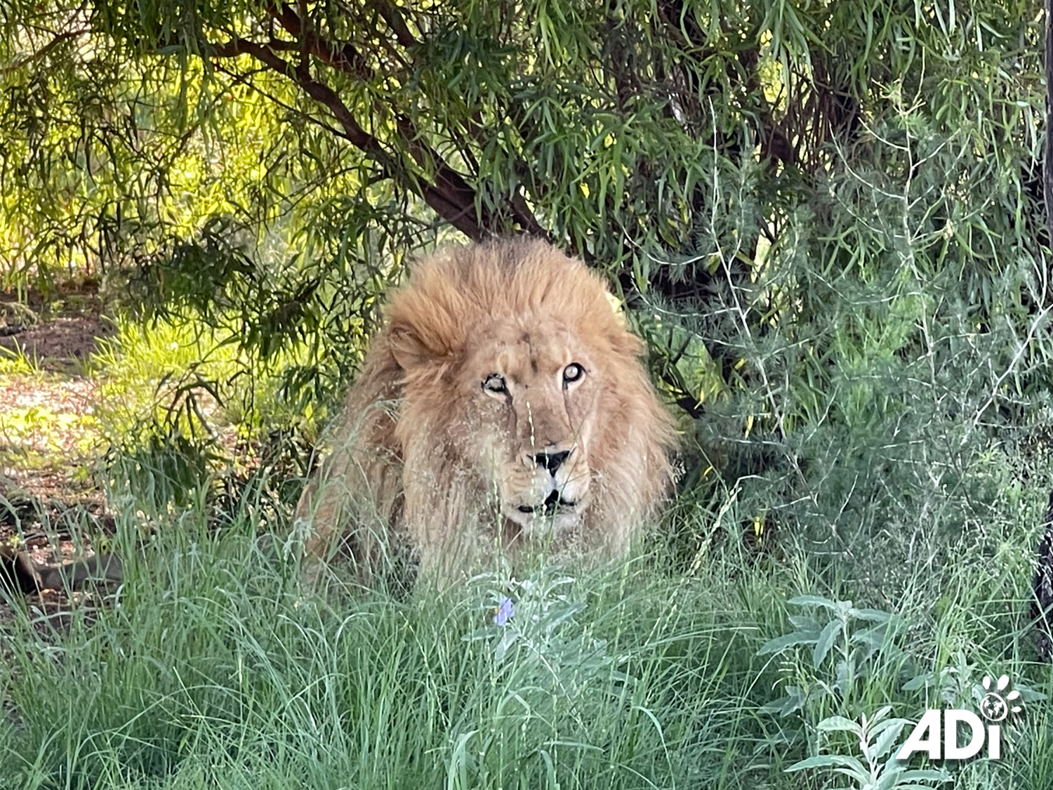 Tarzan settles under the trees in Augie Habitat at the ADI Wildlife Sanctuary, South Africa. It’s four years since he arrived with Tanya from Guatemala on the Operation Liberty Airlift of 17 tigers and lions. Many will remember how Tarzan looked when we rescued him. A tiger had attacked him in the circus and torn his lip from his face and it healed hanging from his chin. Although no longer causing pain it must have been uncomfortable making his mouth dry and collecting bits of dirt and grass. He had a partial lip lift at ADIWS to repair the damage and you can see the difference that made in this picture.