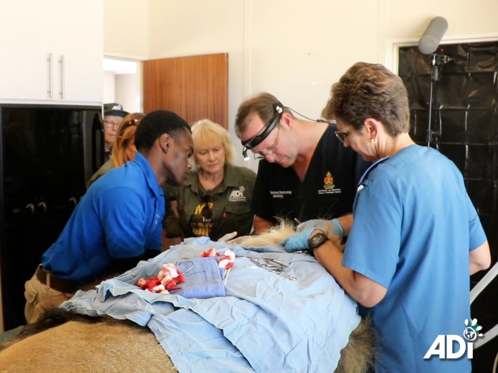 Today, Dr Caldwell sedated Ruben and prepared him for surgery. Veterinary dentist Prof Steenkamp managed to save all four of Ruben’s canine teeth by performing root canal on them. He did however have to remove several teeth on one side of his mouth which were badly damaged. Ruben is believed to have broken them chewing something really hard perhaps metal or stones – we can only speculate. Ruben will need further surgery to remove teeth damaged in the same way on the other side of his mouth, but time ran out today because the veterinarians did not want Ruben sedated for more than three and a half hours because of his other health issues. Dr Caldwell wants to avoid sedating Ruben again and further surgery for several months.