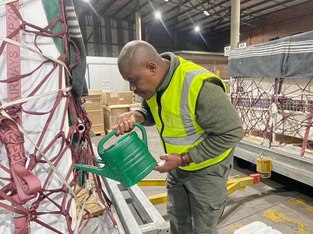 We are disappointed to report that after the exhilaration of arriving in South Africa we are still waiting for the lions to enter the country. We are working to resolve a technical import issue – exacerbated because no offices are open yet. The lions have been given some food and fresh water (pictured Johannes topping up water). Fortunately, one of the reasons ADI builds large travel crates is in case animals get stuck at an airport during a long journey (e.g., due to an aircraft breakdown). The lions are indoors in the cargo area.