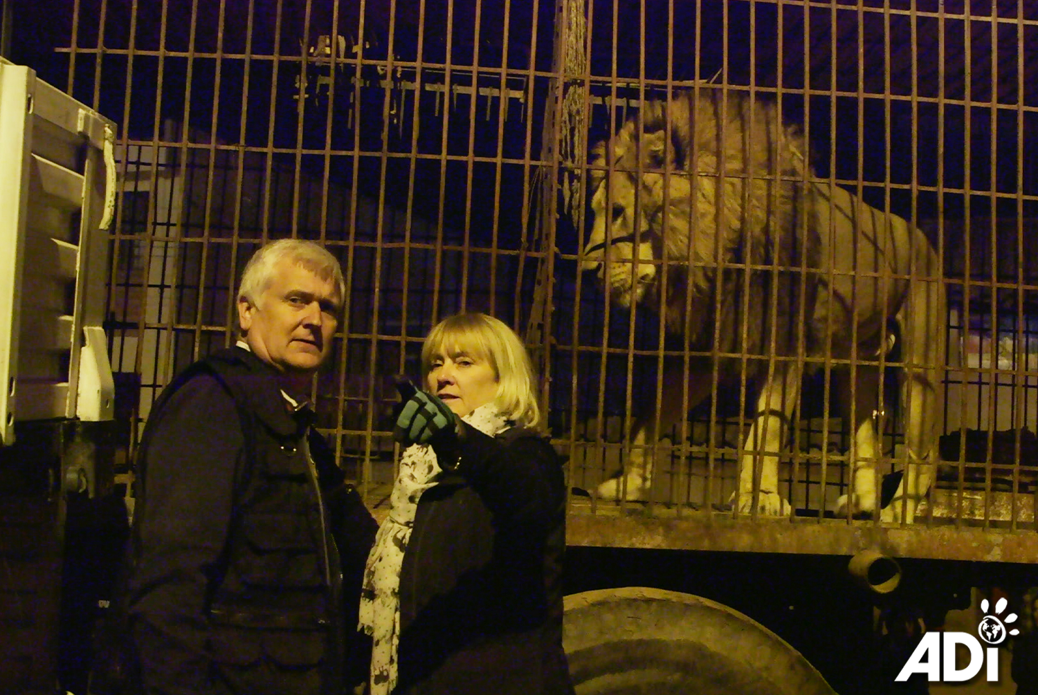 Officials argued with the circus all day and it was 6pm before we went in to load the animals. It was really tense and a frustrating compromise of half voluntary surrender and half law enforcement. The circus had separated Kiara from cubs (Mahla and Scarc), and were refusing to hand over them, a lion called Smith, and Pepe. Circus workers sat down in front of the ADI trucks. We were told to either take the three lions we had loaded (Kiara, Rey, and Amazonas) or hand them back and the future of the other animals would be decided by a court hearing.