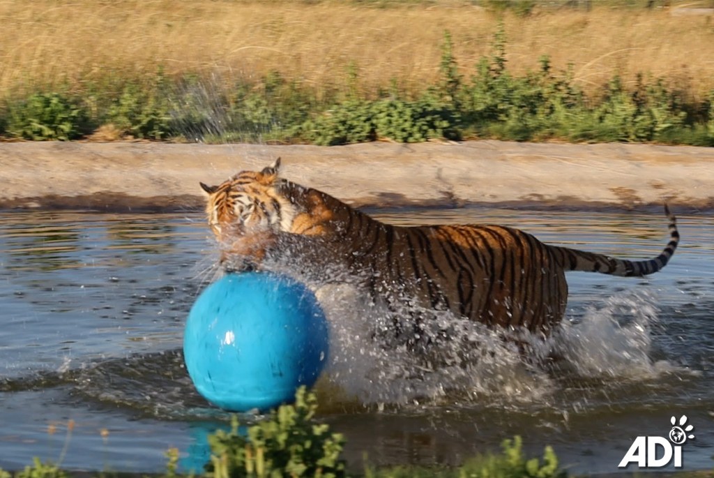 It’s spring in South Africa at the ADI Wildlife Sanctuary and we can feel summer is on its way (December); the sun is shining, the first rains have started to turn the landscape green, and Stripes is playing ball in the pool!