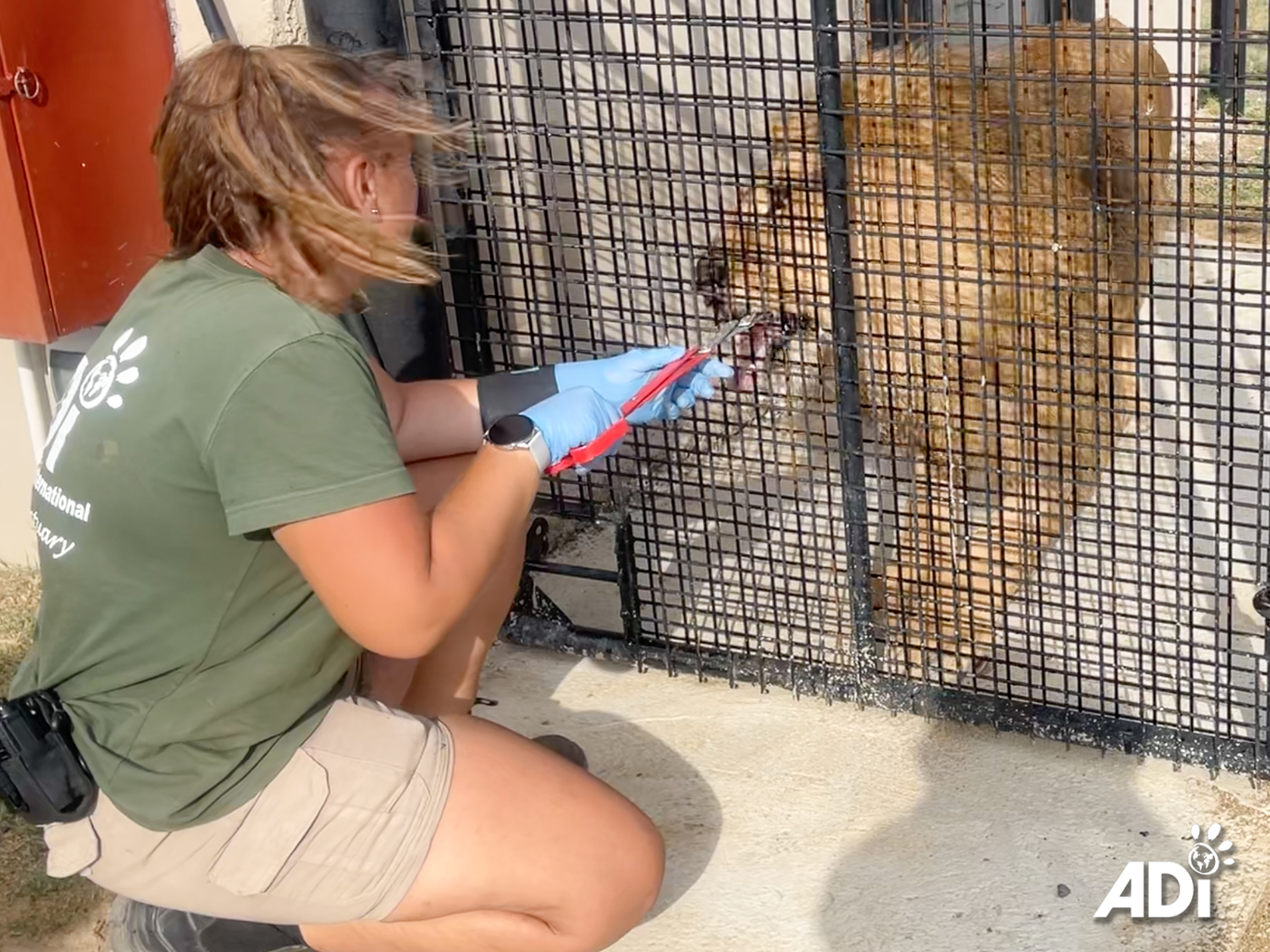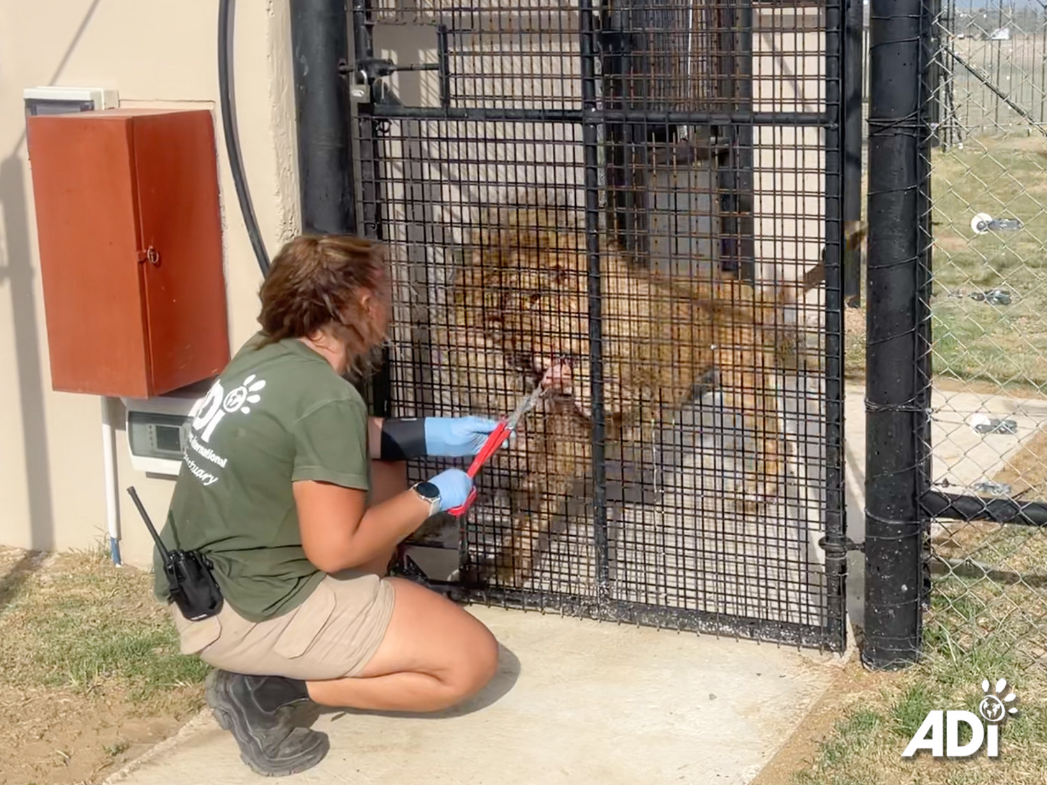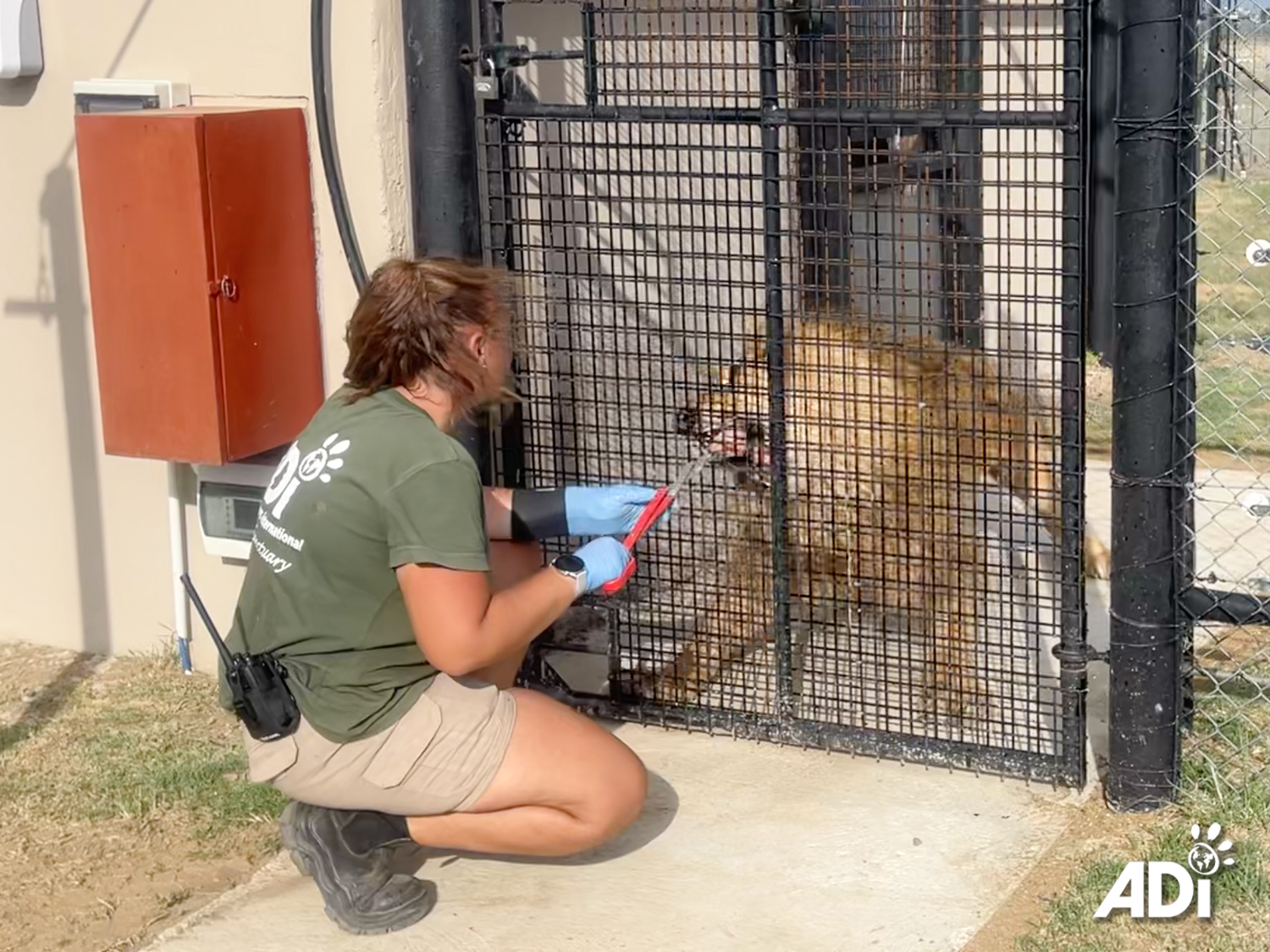 Since arriving back at the ADI Wildlife Sanctuary Muheeb has remained playful, is active, eating and eagerly coming to take his medications in a little treat. Here is Eleanor Roots, Resident Welfare Trainee, giving Muheeb his meds on Friday.