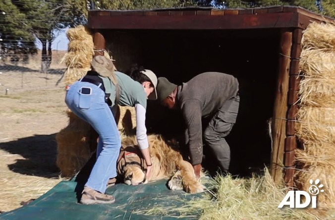 Tarzan was sedated and after a review of his liver and kidney results, Dr Caldwell changed his medication and gave him a boost of vitamins and other supplements. Tarzan does not like sleeping in his house and always favors his den with lioness Tanya. So as Peter worked on Tarzan, the ADIWS team added a special insulated floor and additional insulation around and on top of the den. A heated panel was installed inside, and a channel dug to bury the power cable. All before Tarzan woke up.