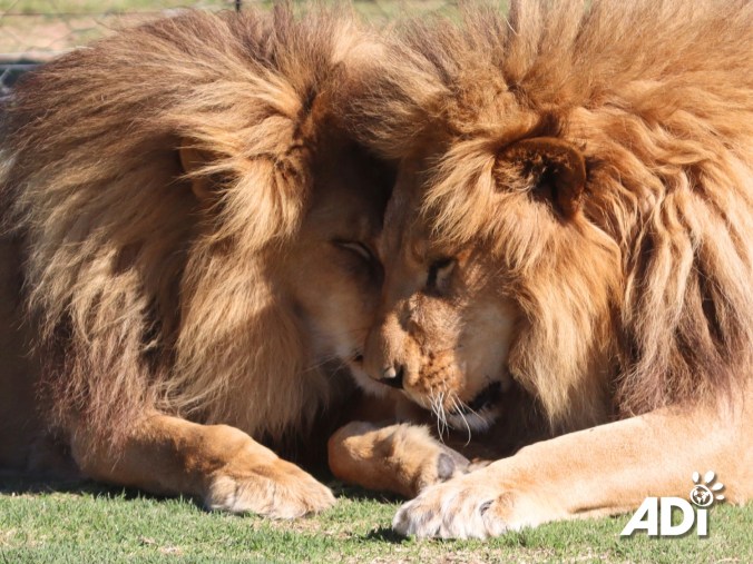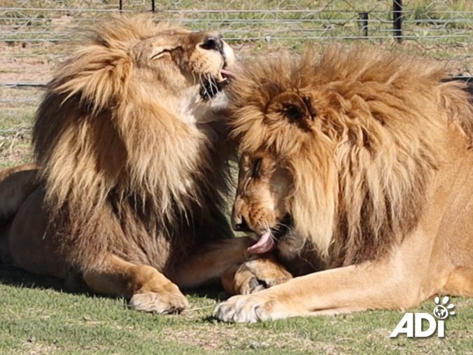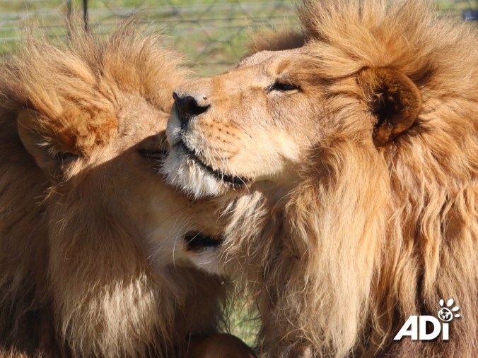 Simba is back with Rey Ayacucho at the ADI Wildlife Sanctuary after a stay at Old Chapel Veterinary Clinic and the boys were clearly delighted to see each other today! Inseparable since their rescue by ADI from a small circus cage in Peru eleven years ago, there was a lot of head rubbing, kissing, and nuzzling as the two senior citizens (both over 17 years old) were reunited.