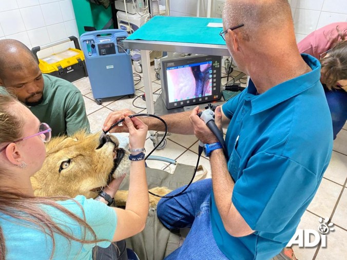 Simba was taken into hospital after suffering occasional nosebleeds. After several days of observation there were no further nosebleeds, so Dr Caldwell sedated him for a thorough physical examination yesterday. He found a large soft tissue mass that could be causing the nosebleeds, but it is not something which can be tackled clinically. Simba’s long-term issues remain, he is elderly now, with chronic health issues related to his former circus life, including arthritis and spondylosis of the neck. Dr Caldwell confirmed that Simba will continue to need close monitoring but for now he has a quality of life and should return to his home in the Guibord-Sprague Habitat with brother Rey, to enjoy their golden years. It’s certainly good to have him back and a huge relief – and we think Rey Ayacucho agrees!