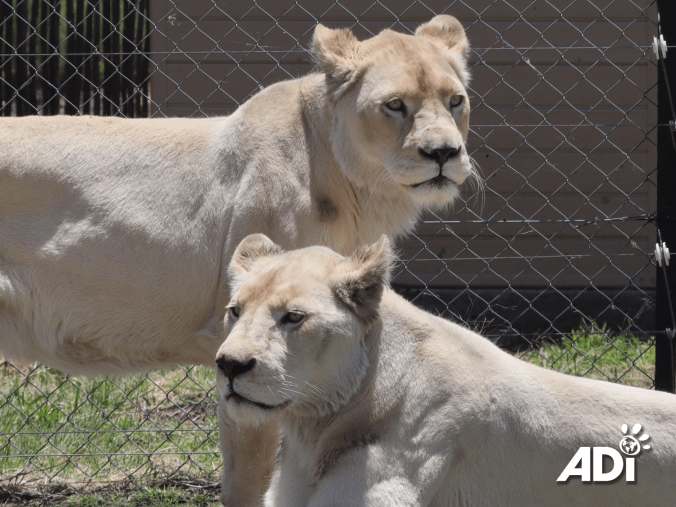 Both lions have only partial sight and we will be assessing their vision to see what adaptations may be needed to their habitat, such as around gates/doorways. They currently have access to a feeding camp of roughly 7,000 square feet and to a 2.5-acre habitat once they are moving around with confidence. White lions, like Lei-ah and Elsa, are the result of a genetic mutation, like albinism. Tragically this mutation is exploited by constant in-breeding for pet sales, with cruel and disastrous effects including deafness, partial or complete blindness and other health problems.