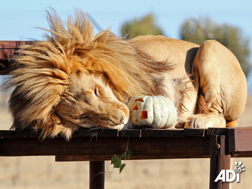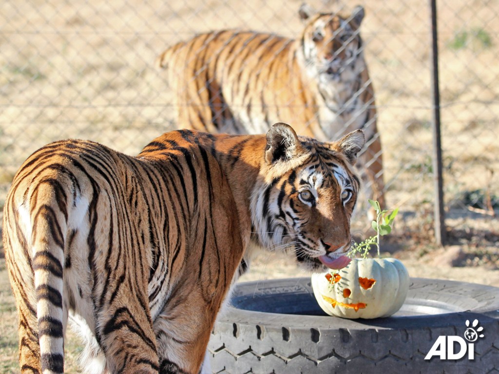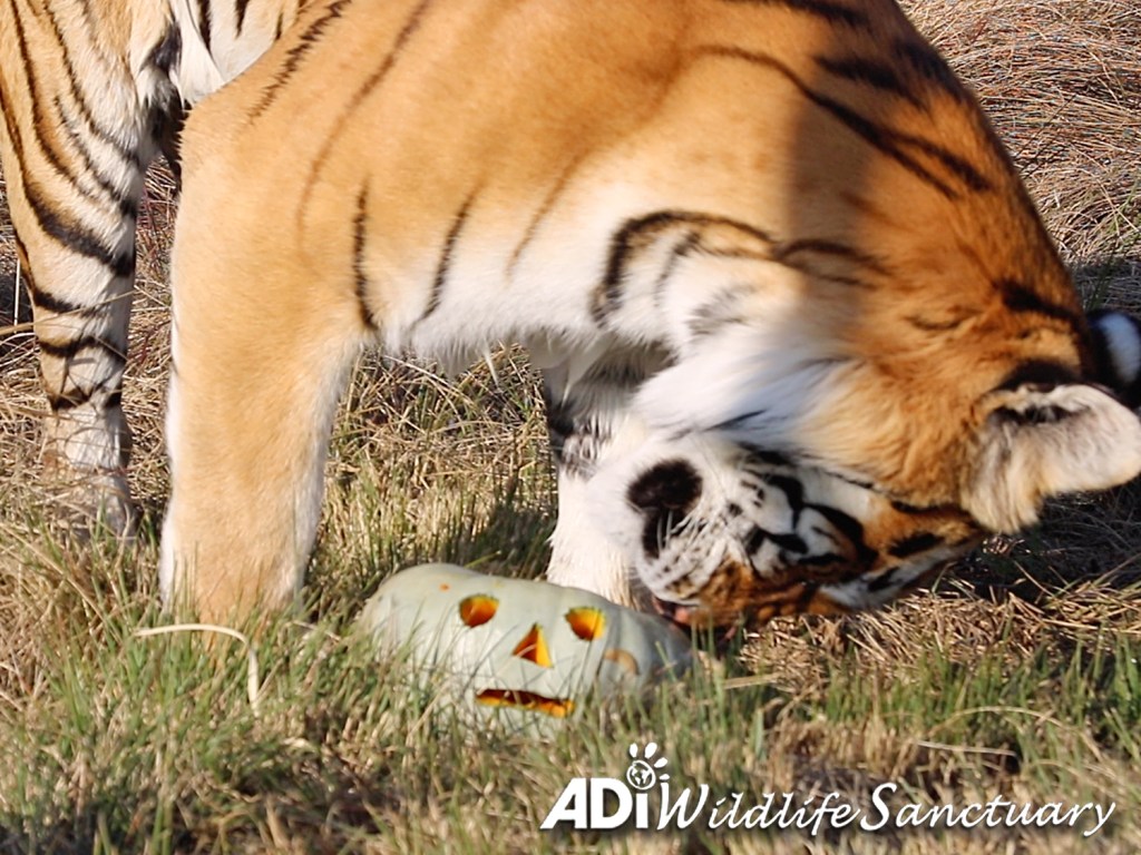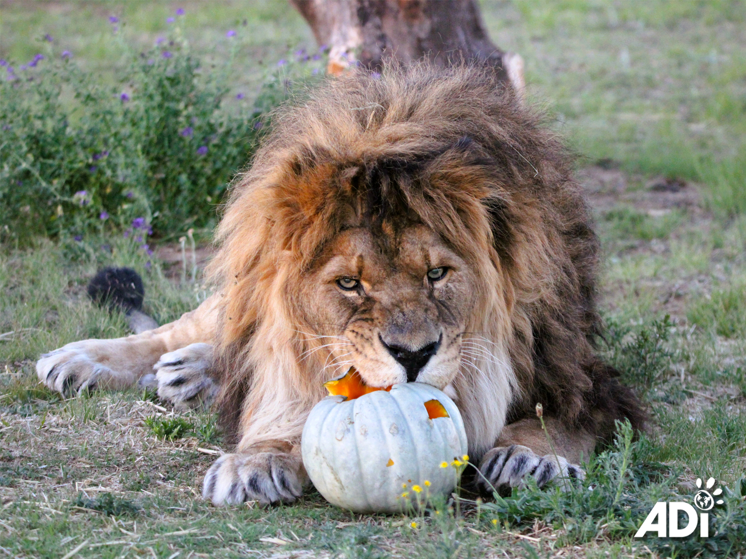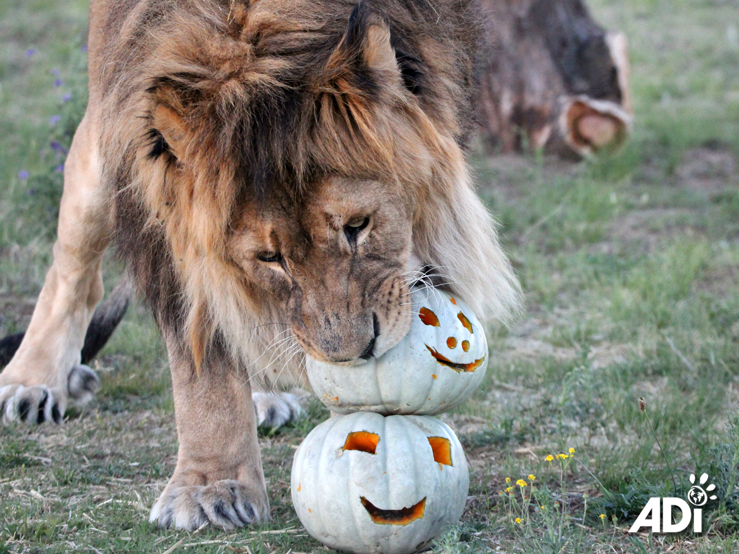 The spookiest time of year is nearly upon us once again, and that means pumpkin fun for our lion and tiger residents at the ADI Wildlife Sanctuary. Most of the big cats at ADIWS were rescued from horrific conditions in circuses where they were forced to perform. I am pleased to say there are NO MORE TRICKS – ONLY TREATS – and you can be part of the fun!