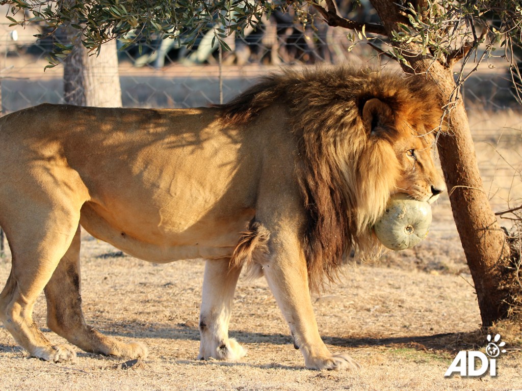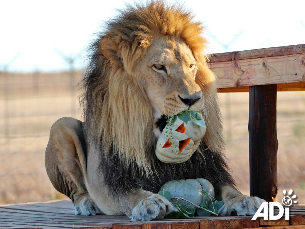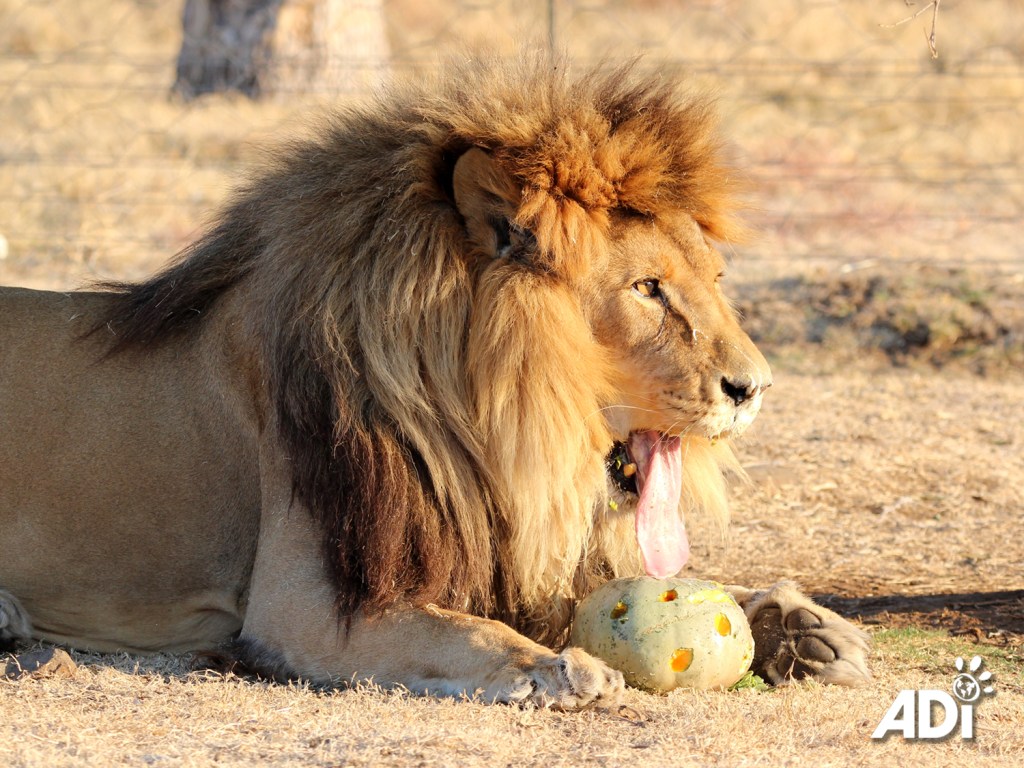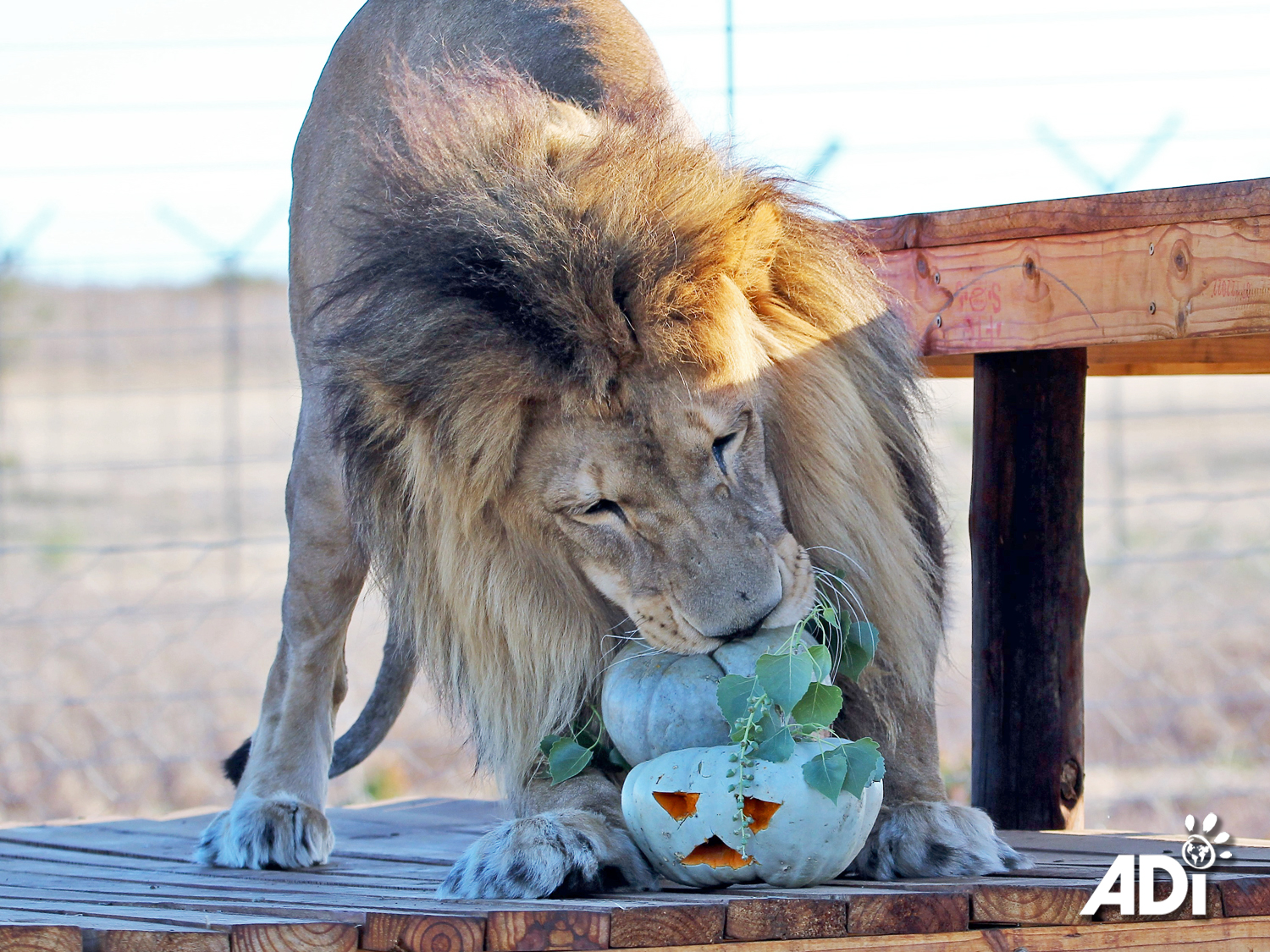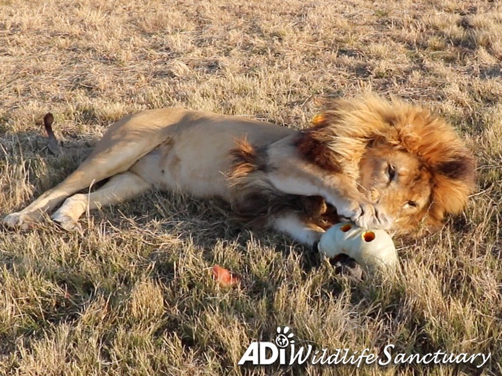 The spookiest time of year is nearly upon us once again, and that means pumpkin fun for our lion and tiger residents at the ADI Wildlife Sanctuary. Most of the big cats at ADIWS were rescued from horrific conditions in circuses where they were forced to perform. I am pleased to say there are NO MORE TRICKS – ONLY TREATS – and you can be part of the fun!
